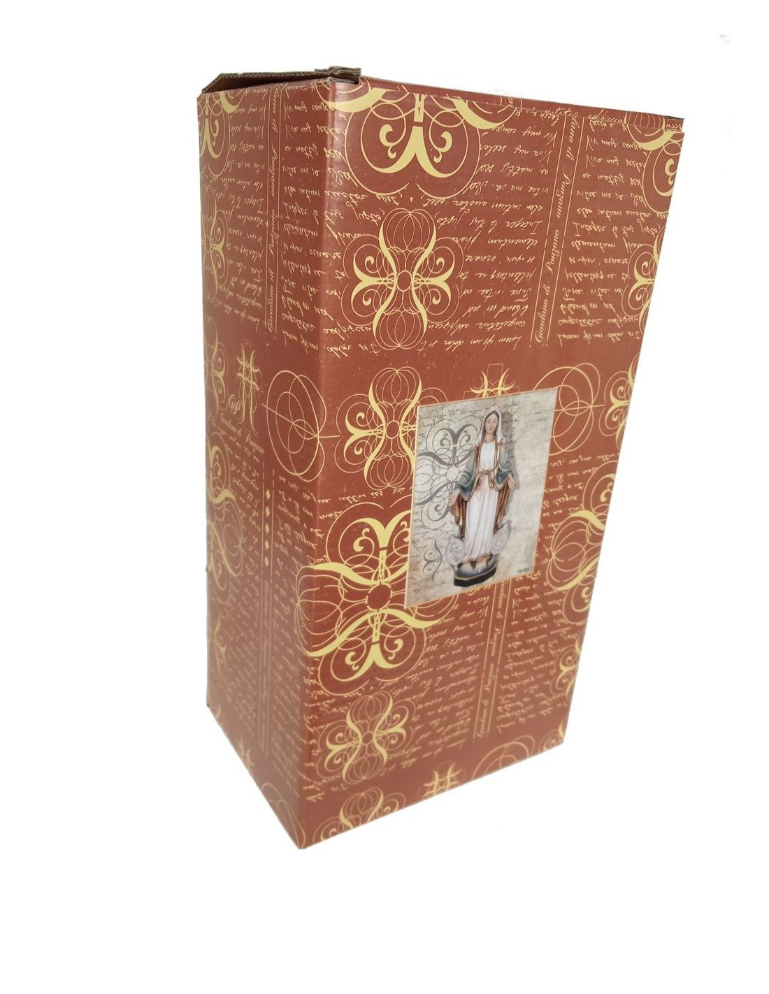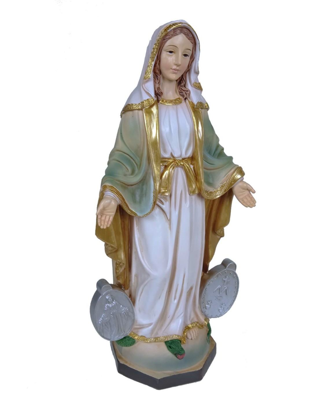 Statue de la Vierge Miraculeuse avec Médailles en Résine et Décoration D'intérieur Peinte à la Main. Mesures : 31 cm.
