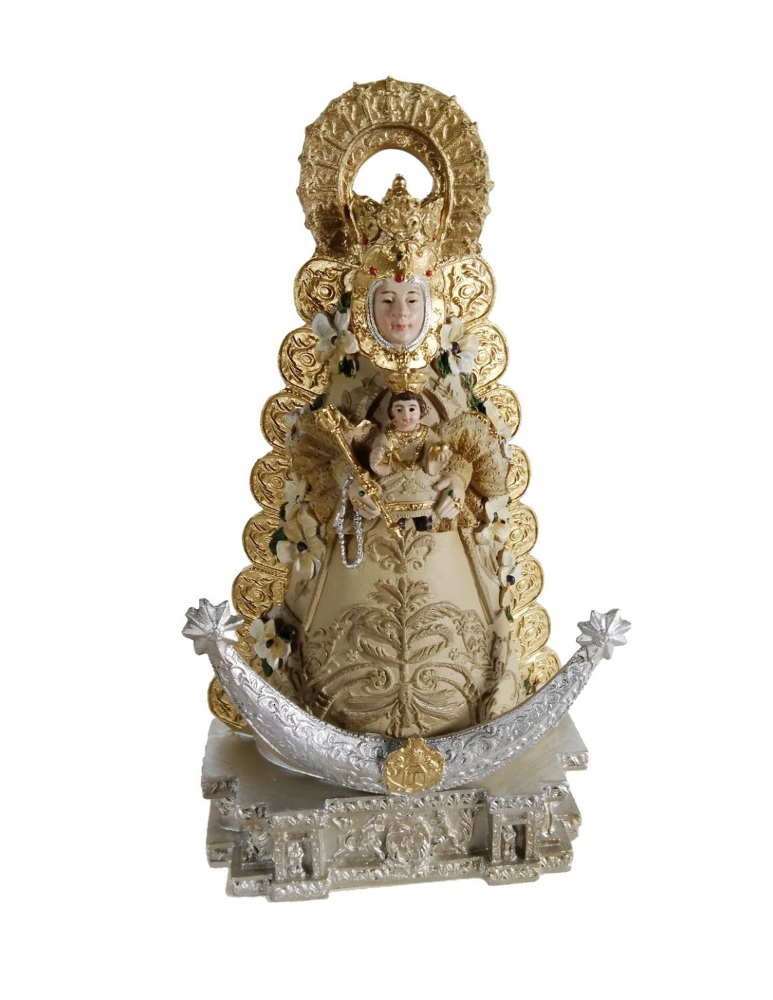 Figure religieuse de la Vierge de Rocío, connue sous le nom de "Blanca Paloma" ou "La Reine des Marais", réalisée en résine et peinte à la main. Idéal pour une dévotion personnelle ou comme cadeau significatif, présenté dans un coffret cadeau.