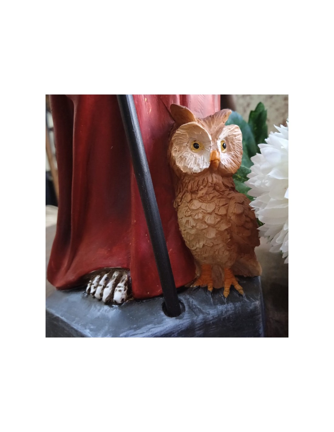 Un hibou comme symbole de sagesse et de protection : Accompagnant la Sainte Mort Rouge, on retrouve un hibou, symbole de sagesse et de connaissance. Cet animal est associé à la protection et au mystère, guidant les âmes et servant de gardien dans la transition entre la vie et la mort.