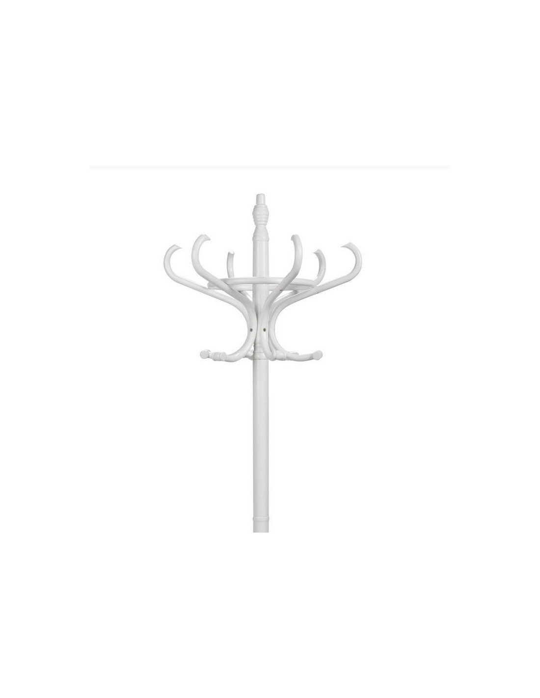 Porte-manteau en bois de couleur blanc avec une tête pivotante avec 12 crochets et quatre pieds réglables avec des butées en caoutchouc. Livré en kit avec notice de montage. Indispensable dans n'importe quel coin de la maison.