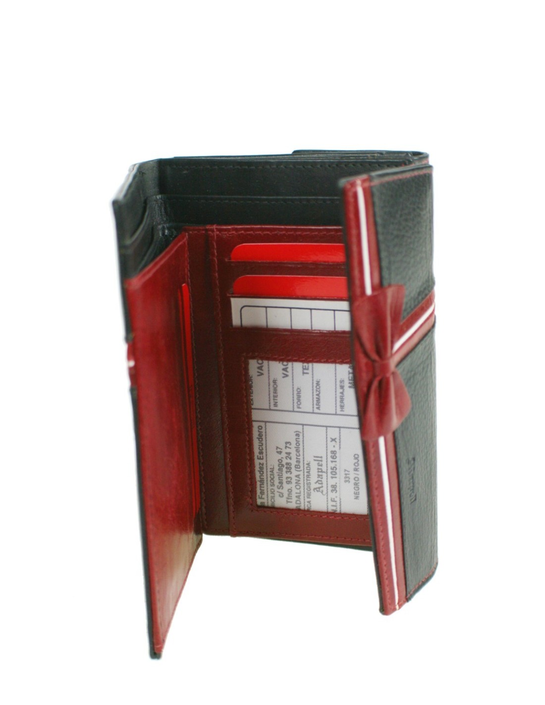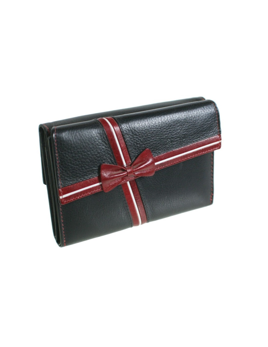 Portefeuille et sac à main pour femme avec fermeture à bouton, 6 emplacements pour cartes, 4 fenêtres, 2 porte-billets, le sac à main contient des compartiments et une fermeture à glissière à l'intérieur. Ce portefeuille en cuir de vachette est très doux au toucher, noir avec détail nœud rouge.