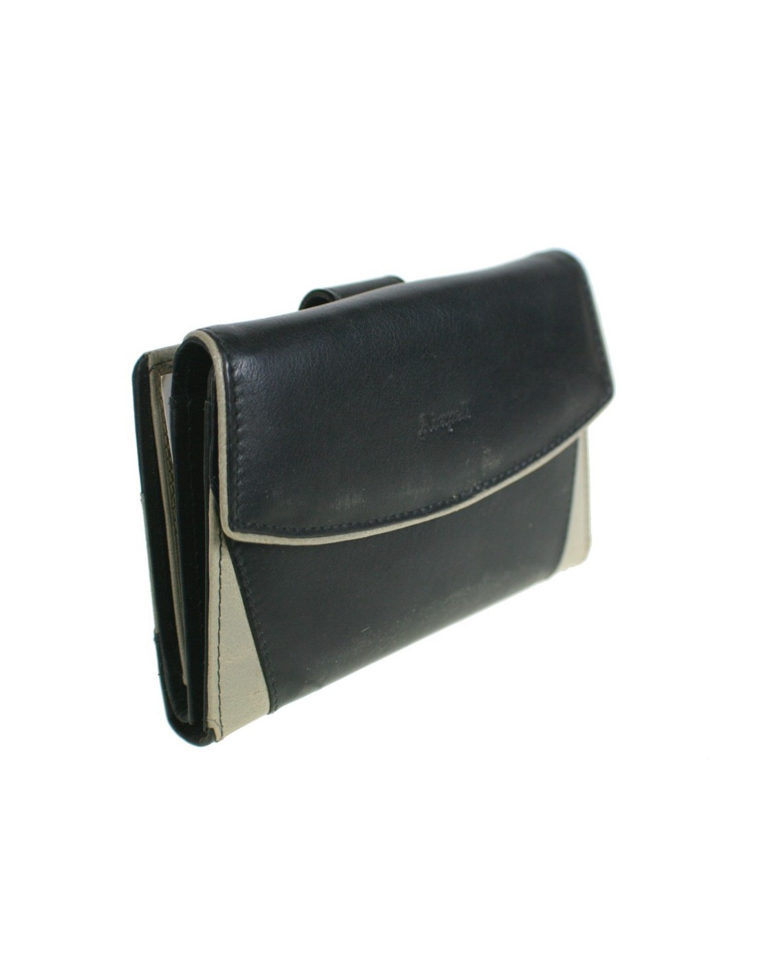 Portefeuille et sac à main pour femme avec fermeture à bouton, 6 emplacements pour cartes, 4 fenêtres, 2 porte-billets, le sac à main contient des compartiments et une fermeture à glissière à l'intérieur. Ce portefeuille en cuir de vachette est très doux au toucher, de couleur noir et gris.
