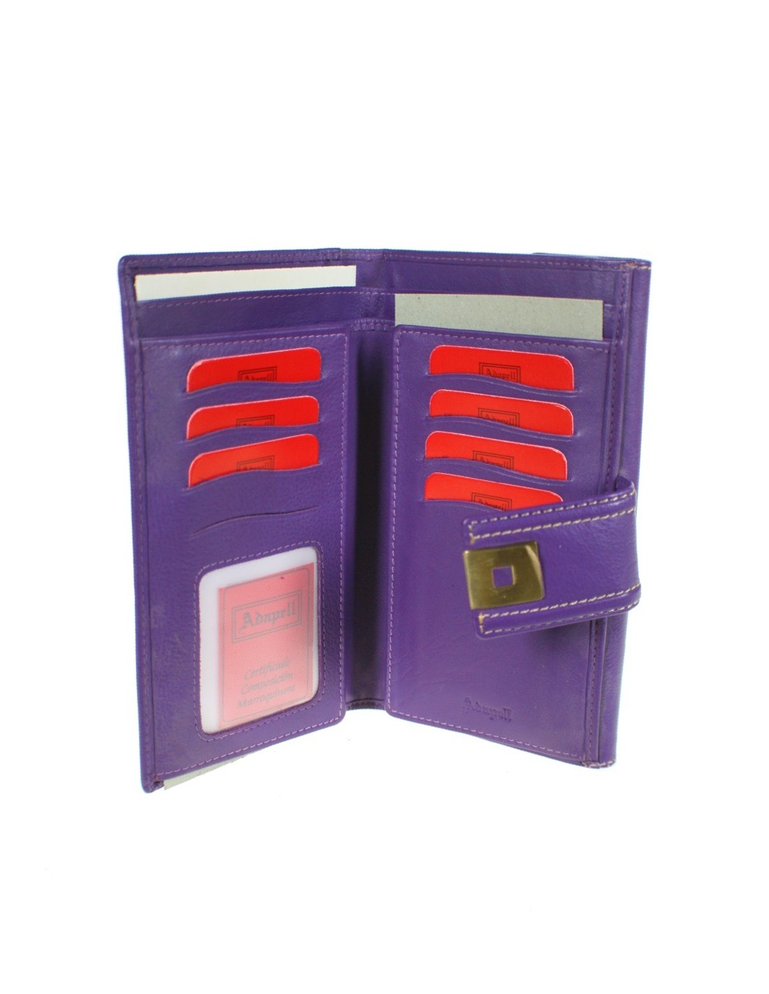 Portefeuille et sac à main pour femme avec fermeture à bouton à l'intérieur, 3 compartiments dont un avec fermeture éclair, 8 fentes pour cartes, 4 fenêtres et 2 porte-billets intérieurs. Ce portefeuille en cuir de vachette est très doux au toucher, de couleur lilas et fermeture boutonnée.