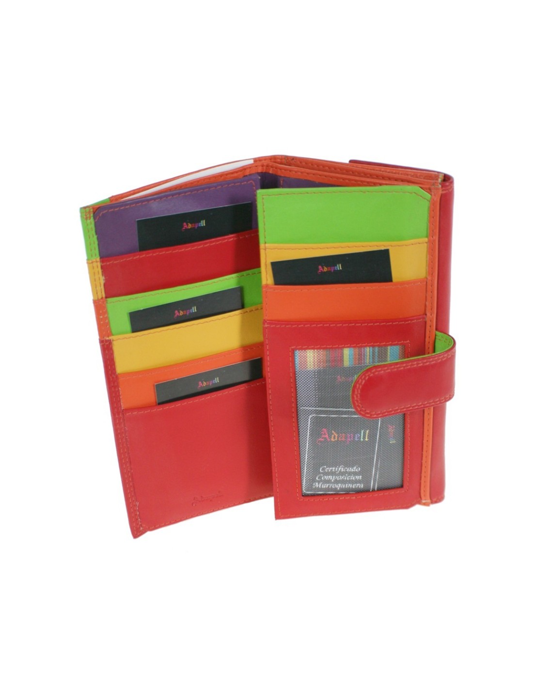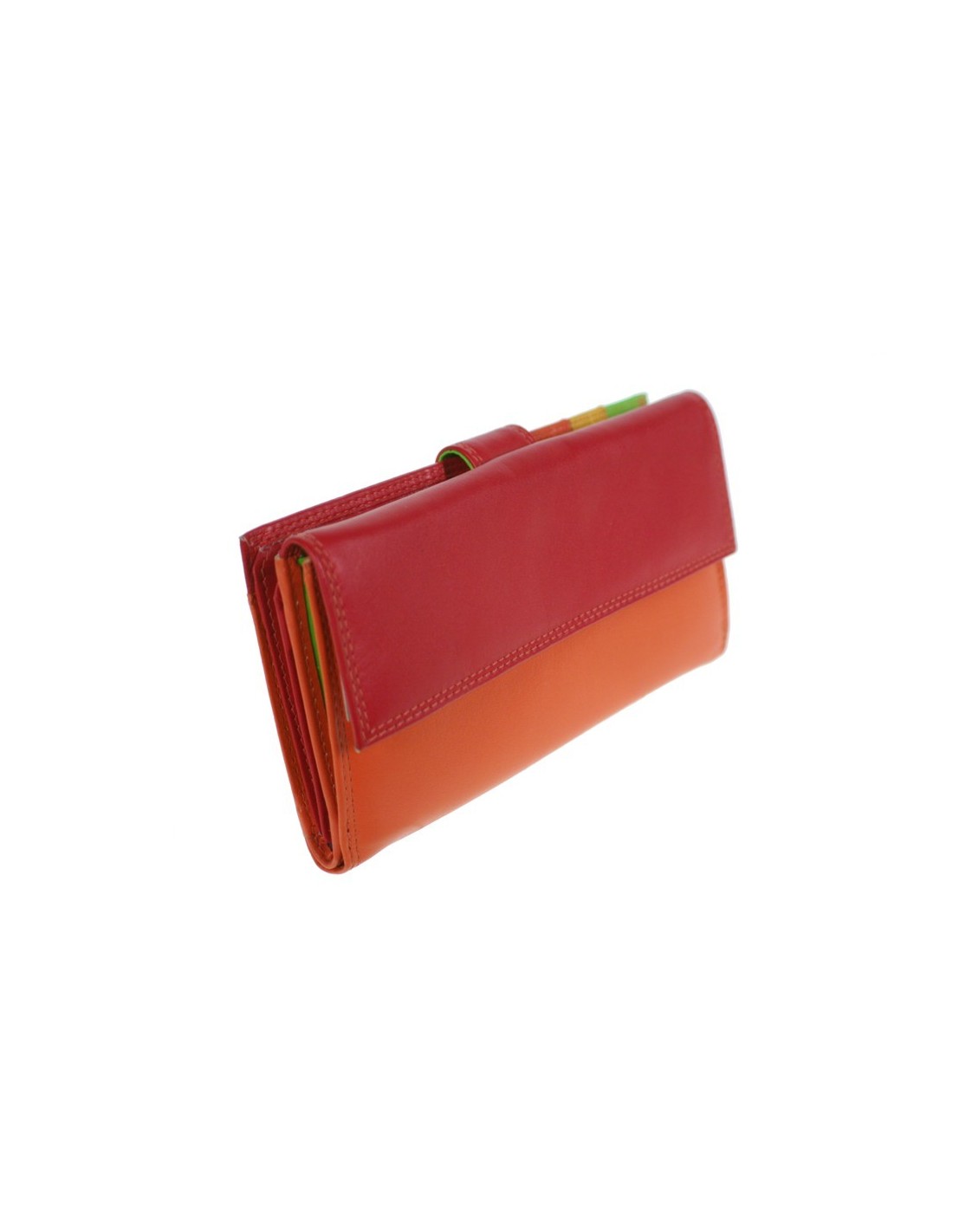 Portefeuille et sac à main pour femme avec fermeture à bouton, 12 fentes pour cartes, 4 fenêtres, 1 compartiment et 1 porte-billets à l'intérieur. Ce portefeuille en cuir de vachette est très doux au toucher, de couleur orange et rouge et fermeture à boutons.