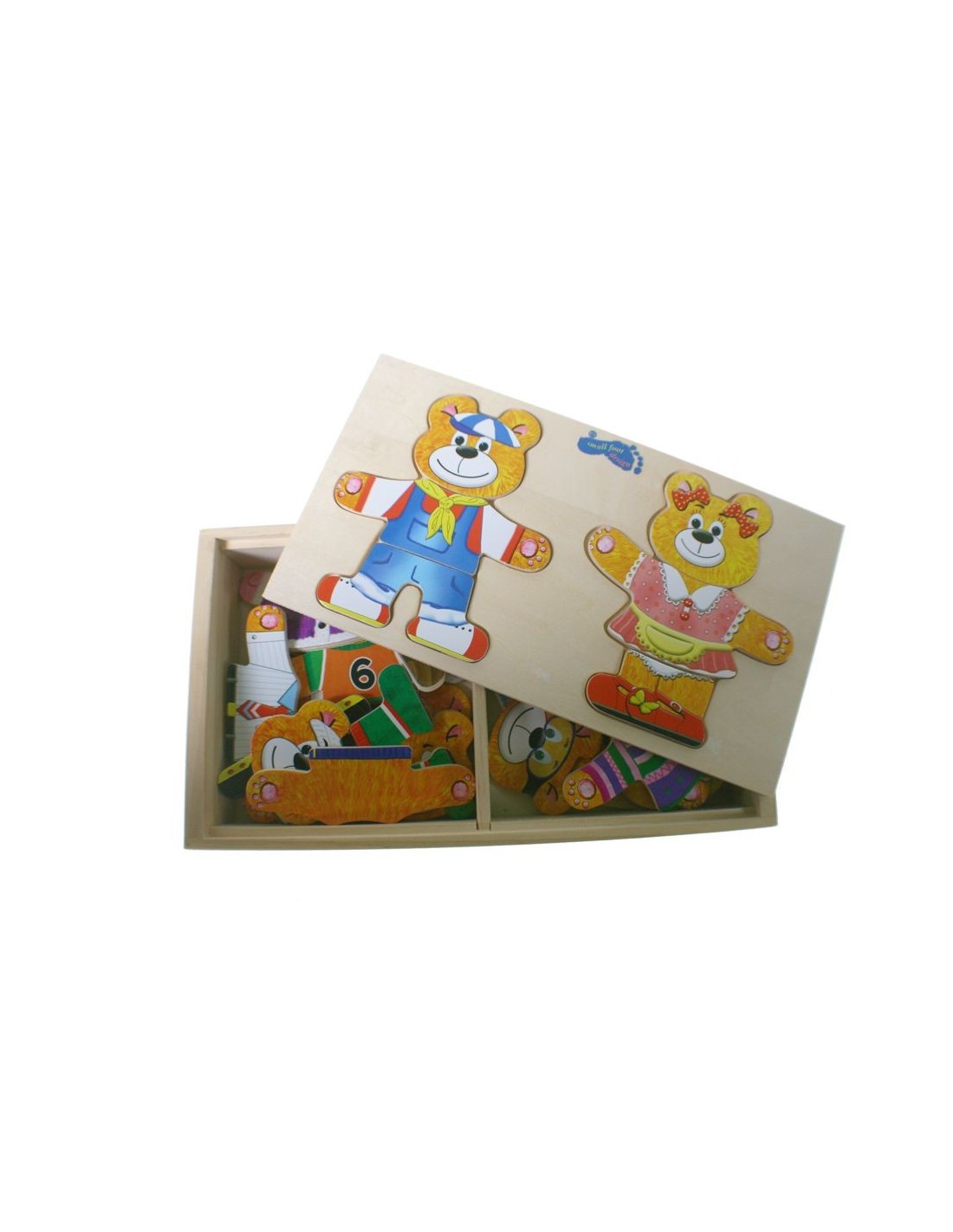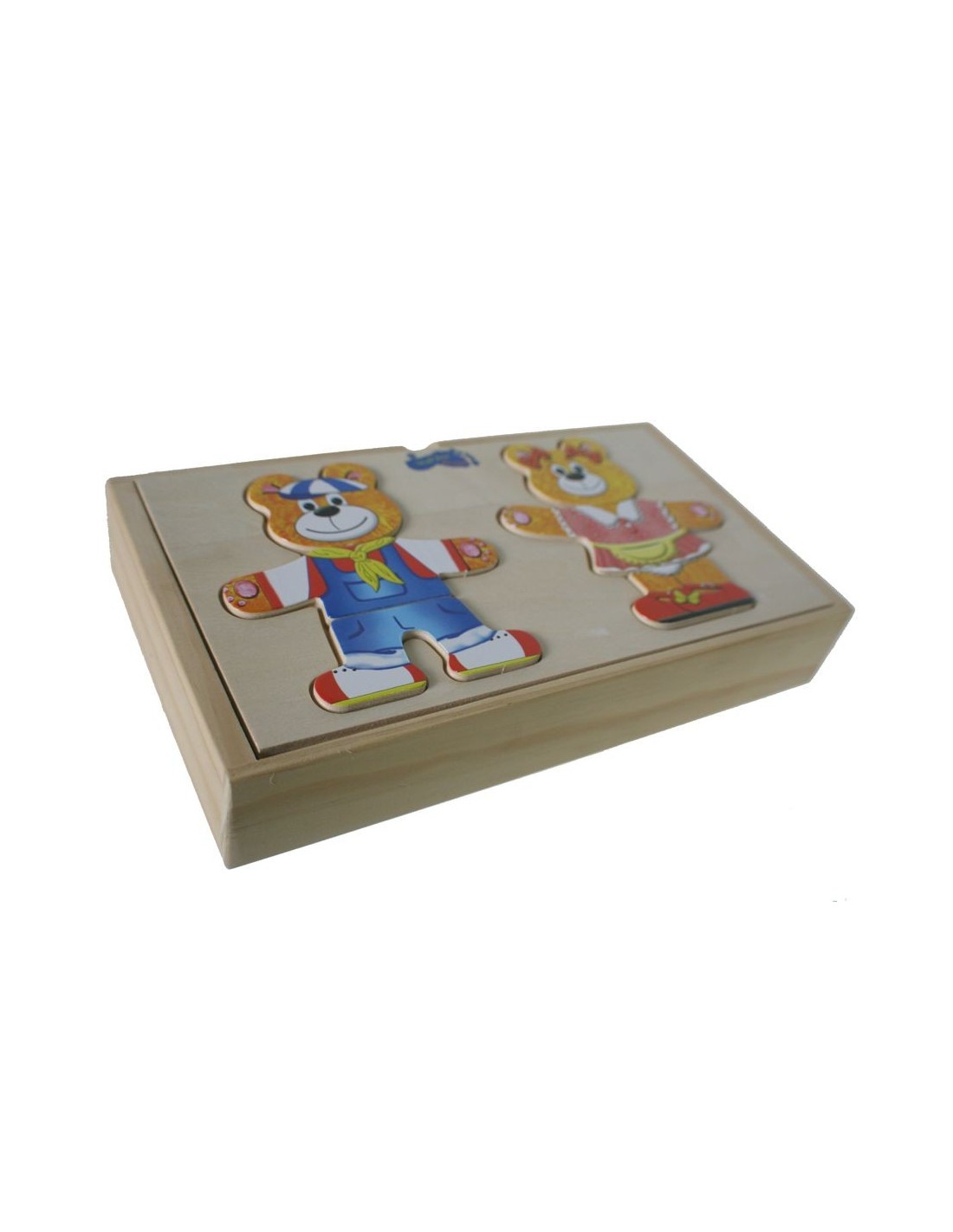 Puzzle Ours et Ours avec des robes à habiller dans un coffret en bois classique et jeu de coordination. Dimensions: 4x25x14 cm.