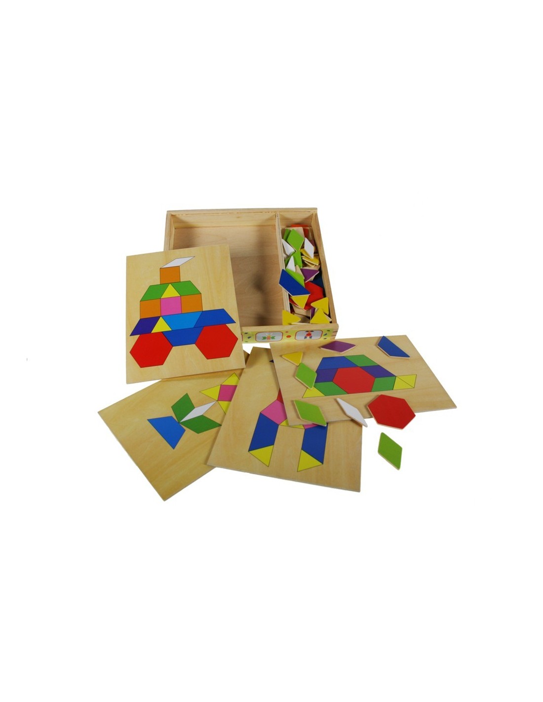 Un puzzle mosaïque dans une boîte en bois, composé de pièces colorées, permettant des compositions infinies. Idéal pour stimuler la créativité, la mémoire visuelle, la motricité fine et la reconnaissance des formes.