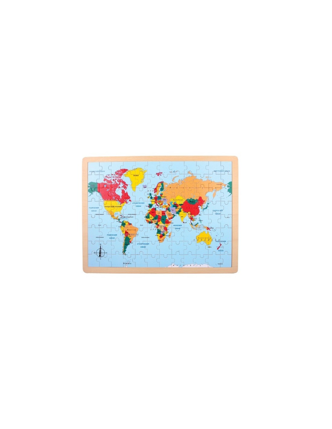 Puzzle en bois mers continents et pays du monde description dans le jeu éducatif pour enfants allemands. Dimensions : 30x40 cm.