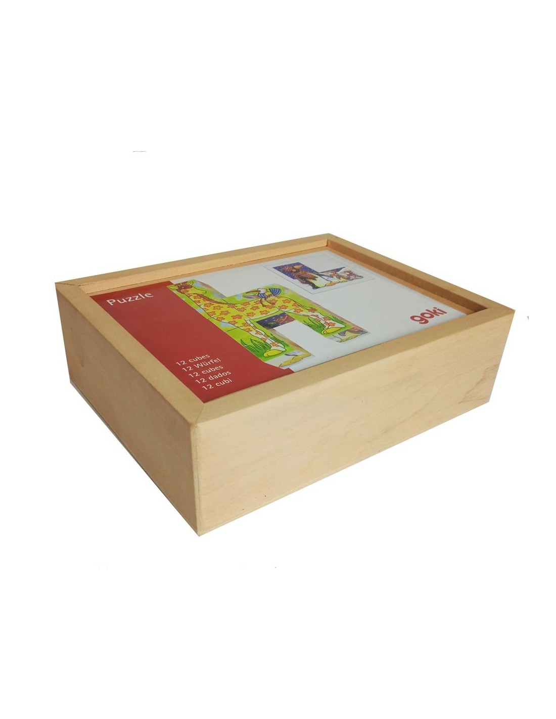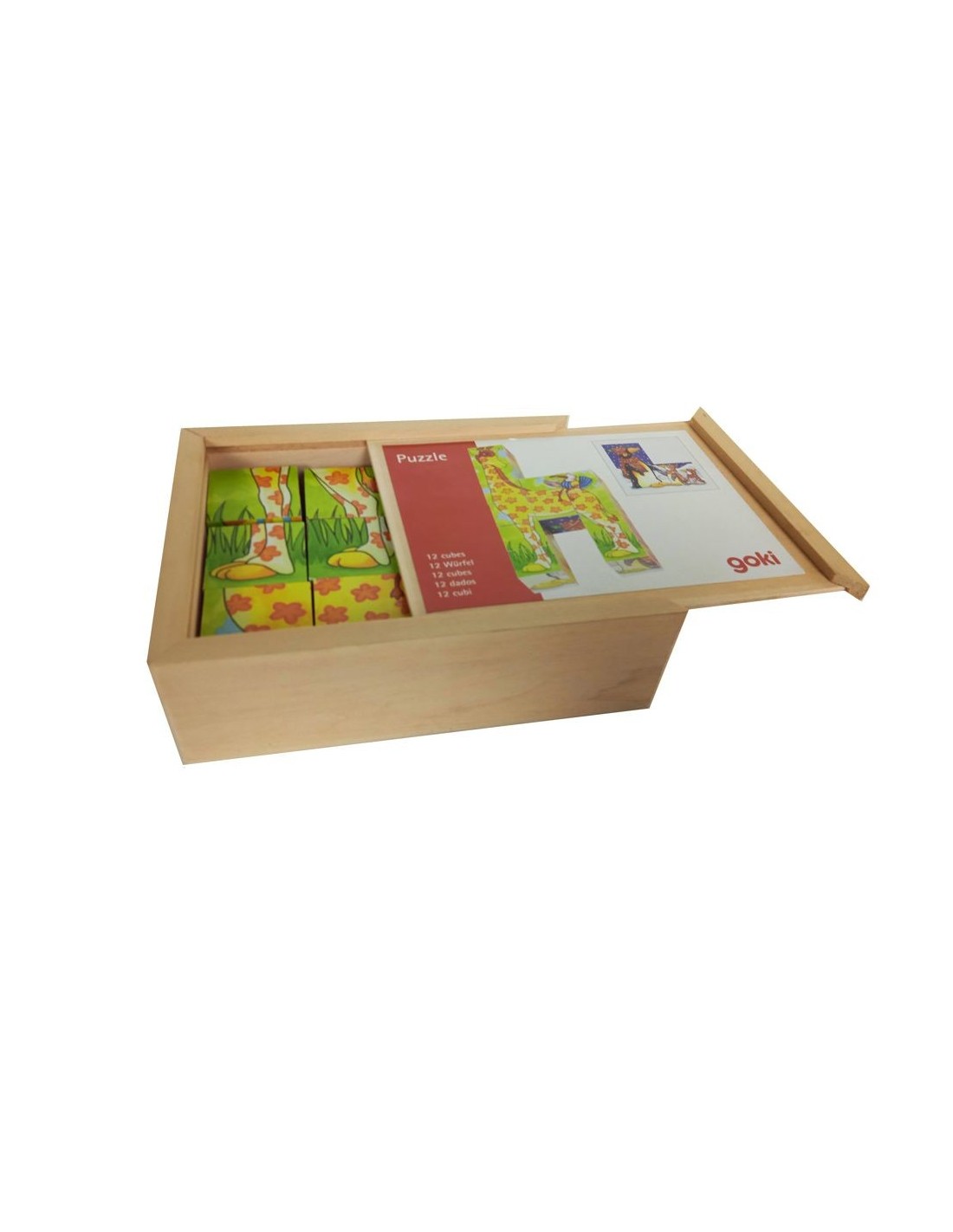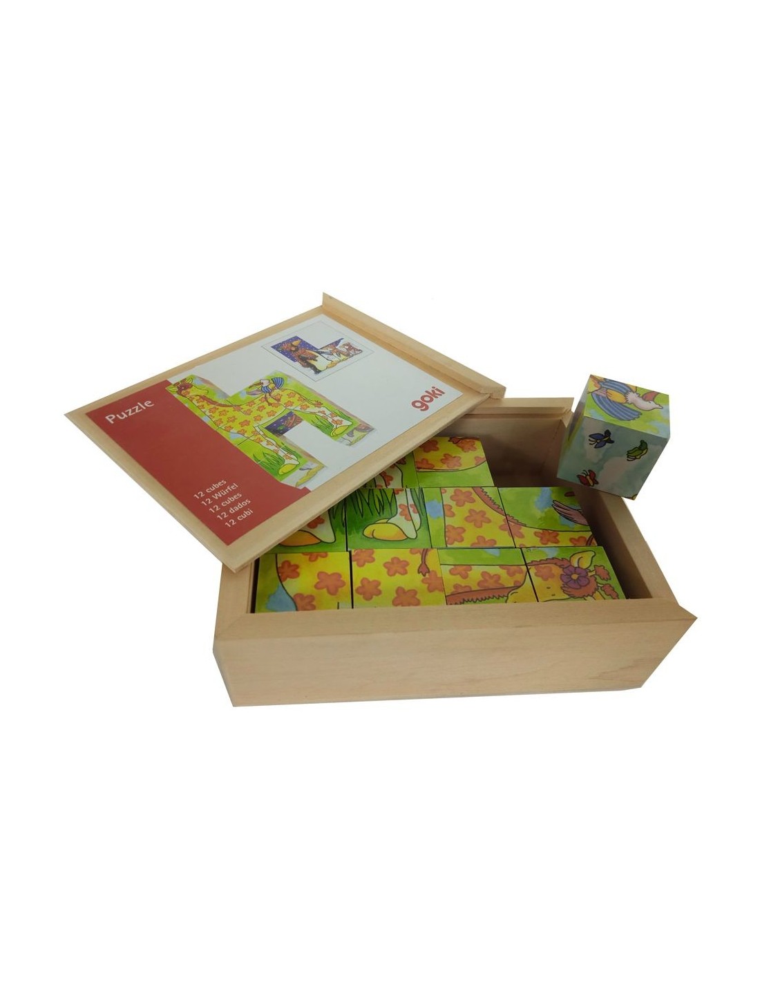 Un puzzle classique pour enfants composé de douze cubes en bois formant six images différentes. Stimule la motricité fine, la mémoire visuelle et la concentration.