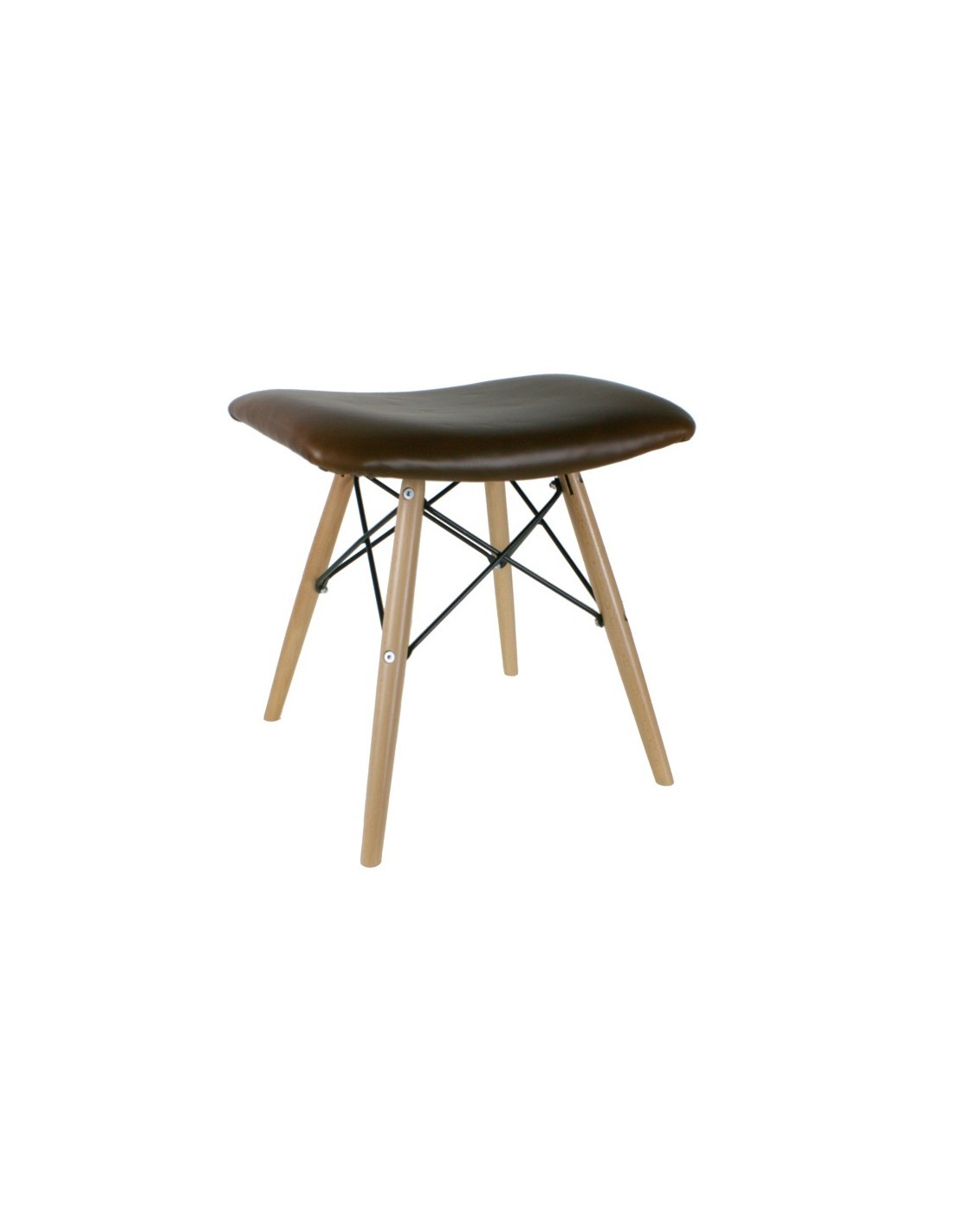 Repose-pieds en bois marron et similicuir, Détente et Confort, Buffet nordique vintage. Dimensions : 46 x 44 x 35 cm.