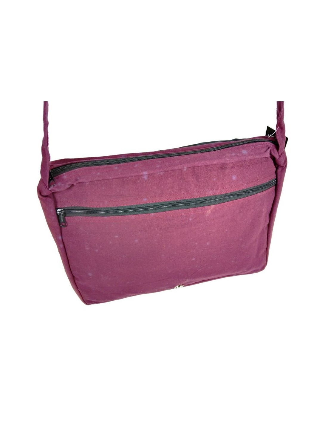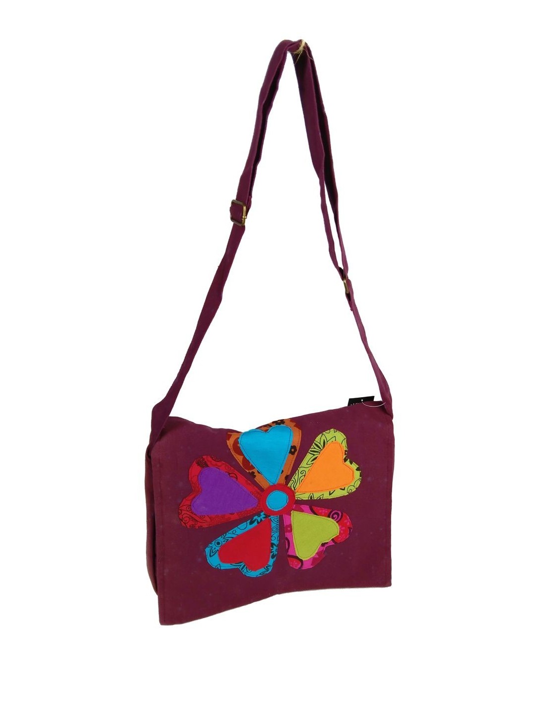 Sac brodé hippie ethnique multi-usages avec rabat et anses en tissu de coton bordeaux. Mesures : 29x35 cm.