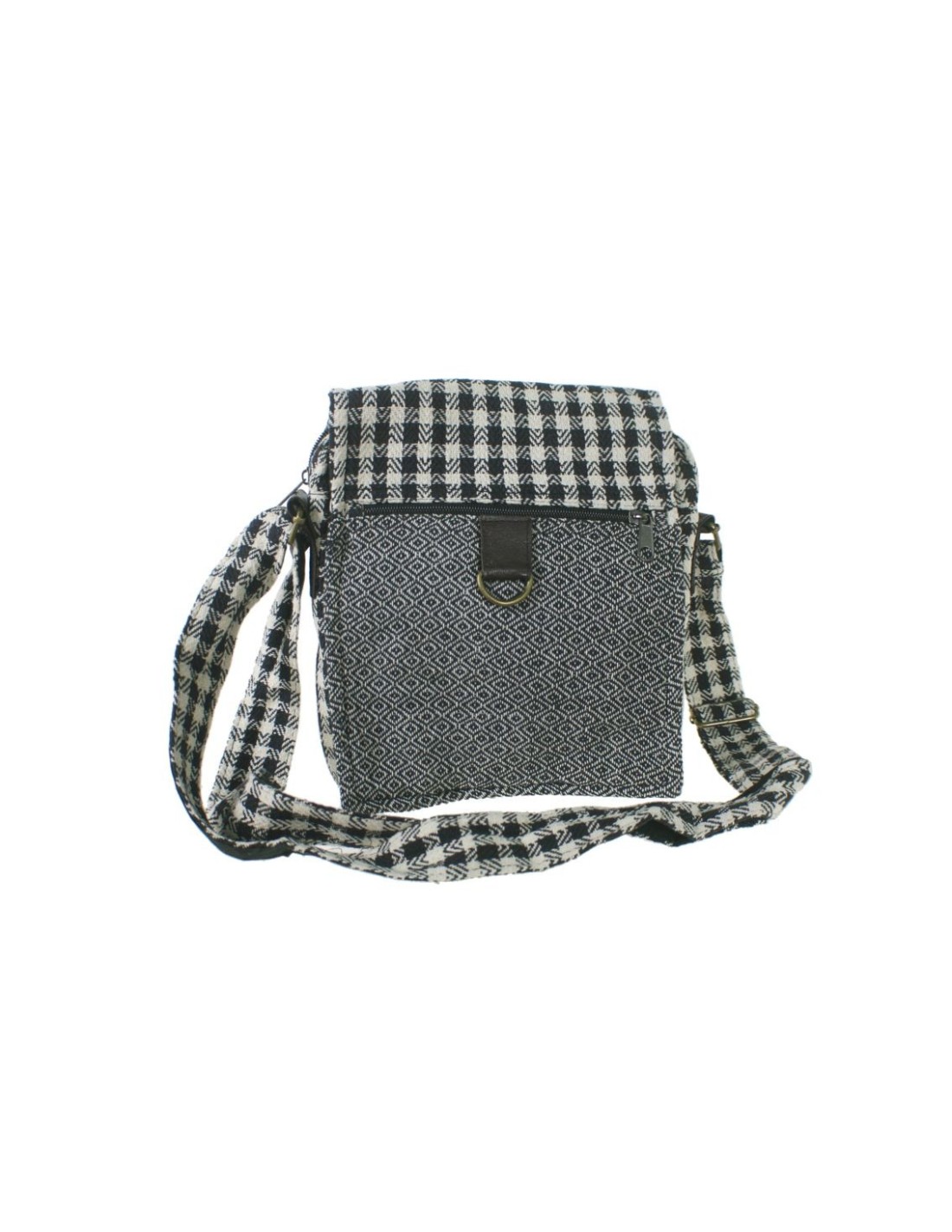 Petit sac à bandoulière multi-usage en tissu de coton noir blanc avec fermeture à glissière, design hippie ethnique exclusif avec rabat et poche intérieure. Ce vêtement a été fabriqué à la main au Népal. Ce sac peut devenir un indispensable au quotidien dans lequel vous pourrez transporter vos objets.
