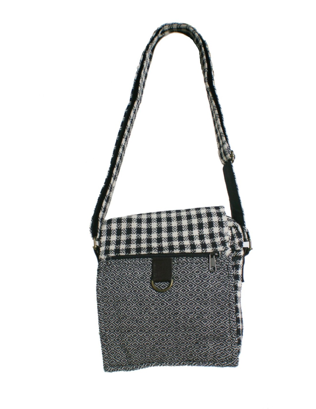 Petit sac polyvalent au design hippie ethnique avec rabat et poignées de couleur noir blanc. Dimensions: 21x20x5 cm.