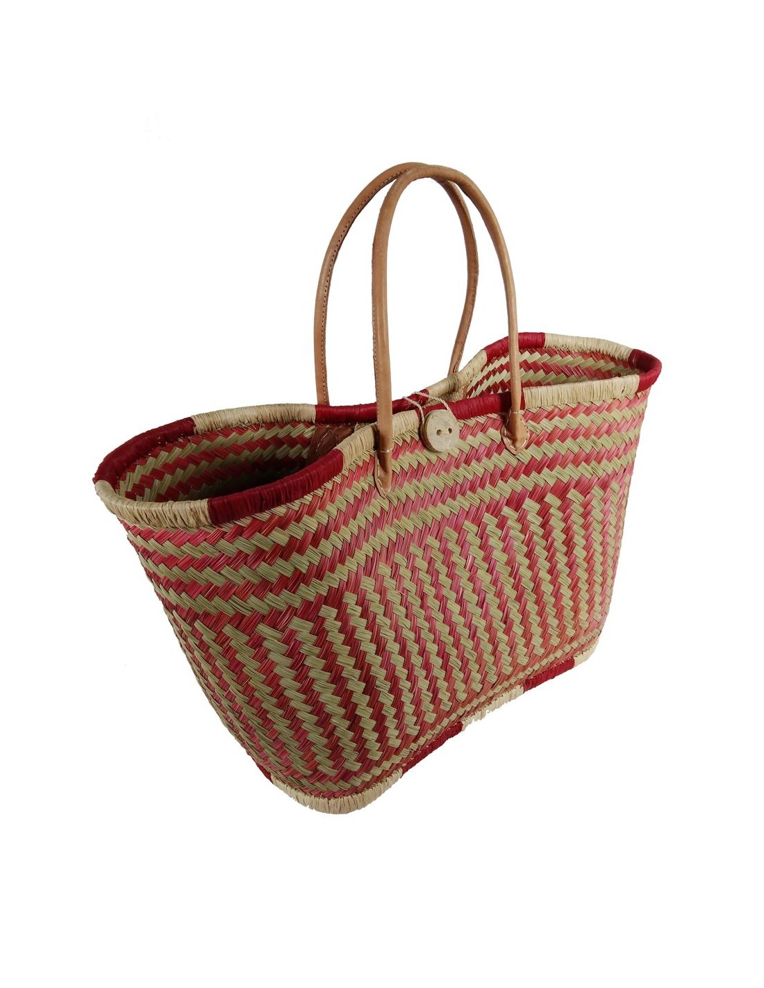Panier tissé à la main dans des tons naturels et rouges, avec poignées en cuir, fermeture à bouton en bois et poche intérieure. Pratique, léger et très stylé.