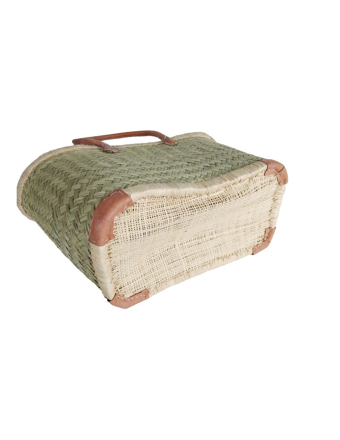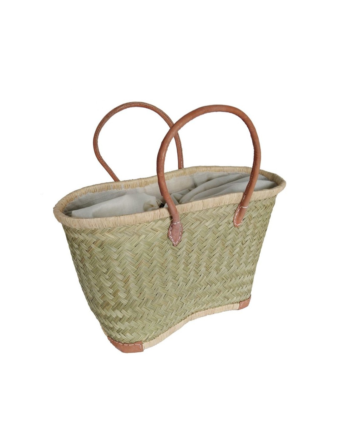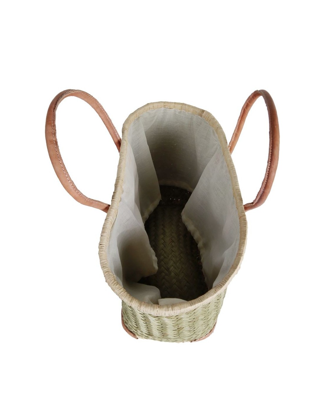 Panier cabas en raphia avec anses en cuir et intérieur fermé par un cordon vert pâle. Idéal pour les courses quotidiennes.