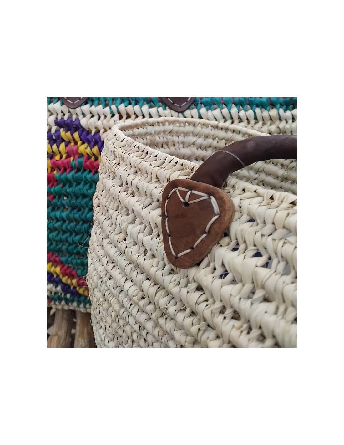 Un grand panier tissé à la main en palmier naturel, avec des poignées en cuir. Idéal pour le shopping, la plage ou comme cadeau fonctionnel et élégant.