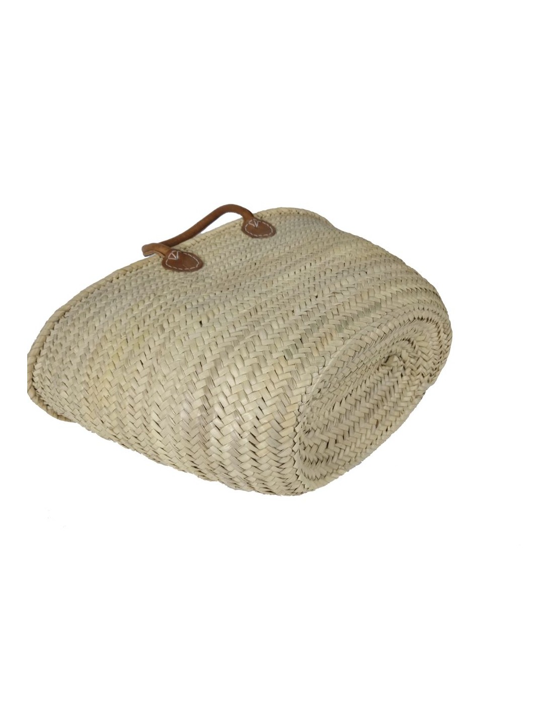 Grande nacelle en feuille de palmier de Majorque, panier à provisions avec poignée en cuir. Dimensions : 36x53x25 cm.