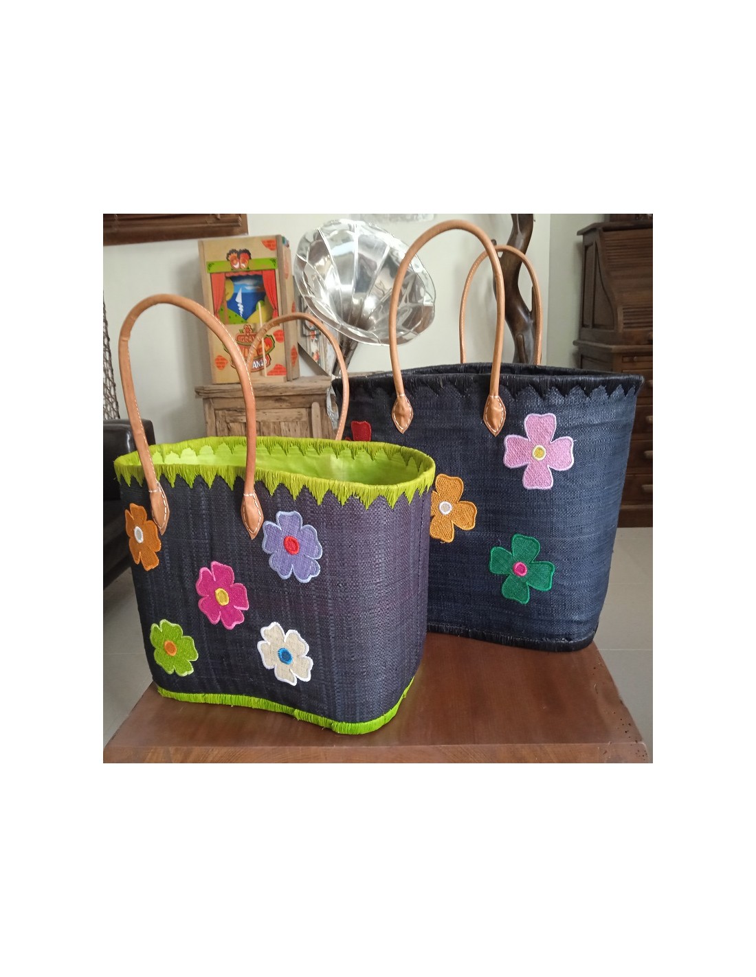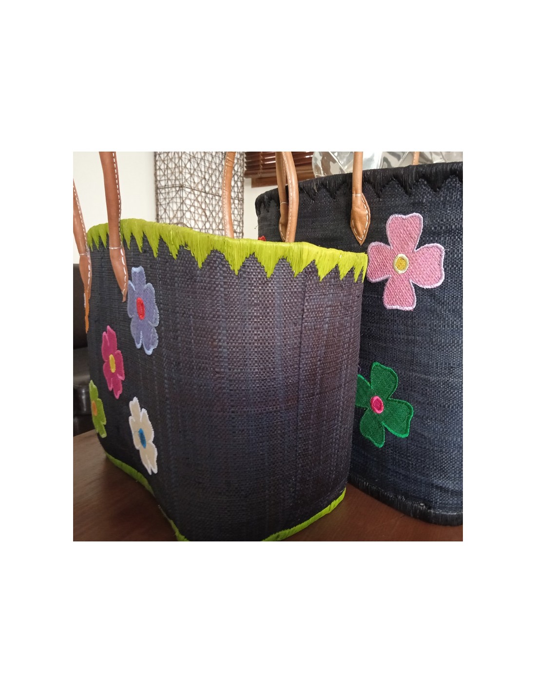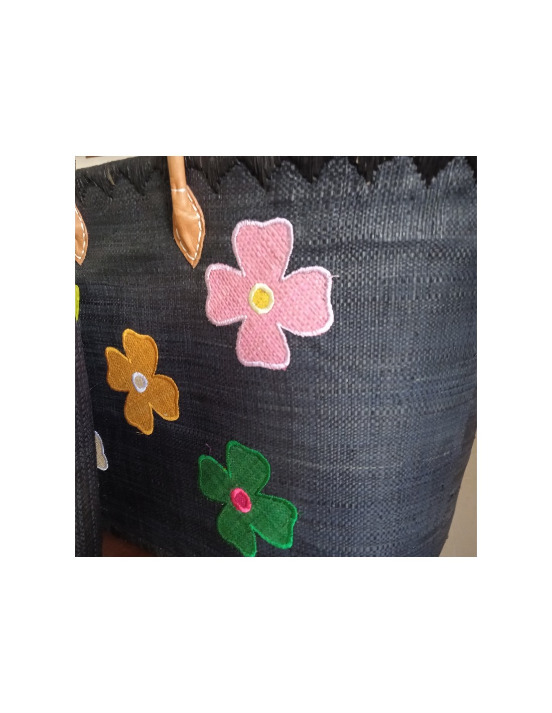 Panier de courses en raphia noir avec détail floral et poignée en cuir. Dimensions : 38x48x30 cm.