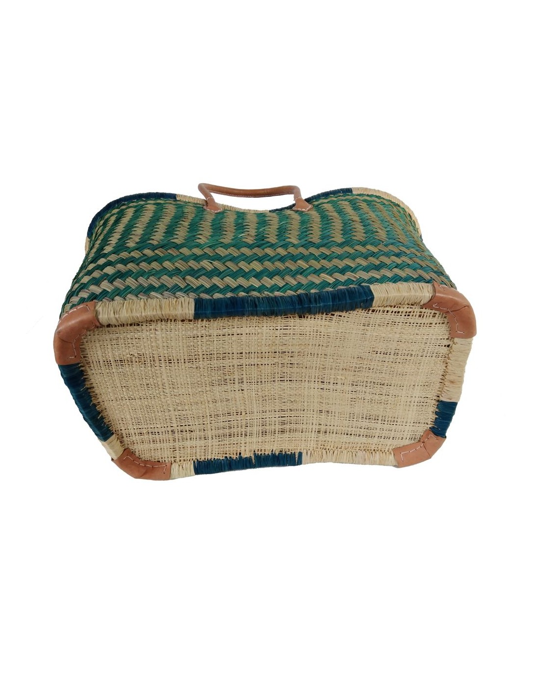 Panier fait main avec palmier tressé dans des tons naturels et verts, poignées en cuir et fermeture intérieure pratique en tissu bleu. Idéal pour aller à la plage, en balade ou au marché.