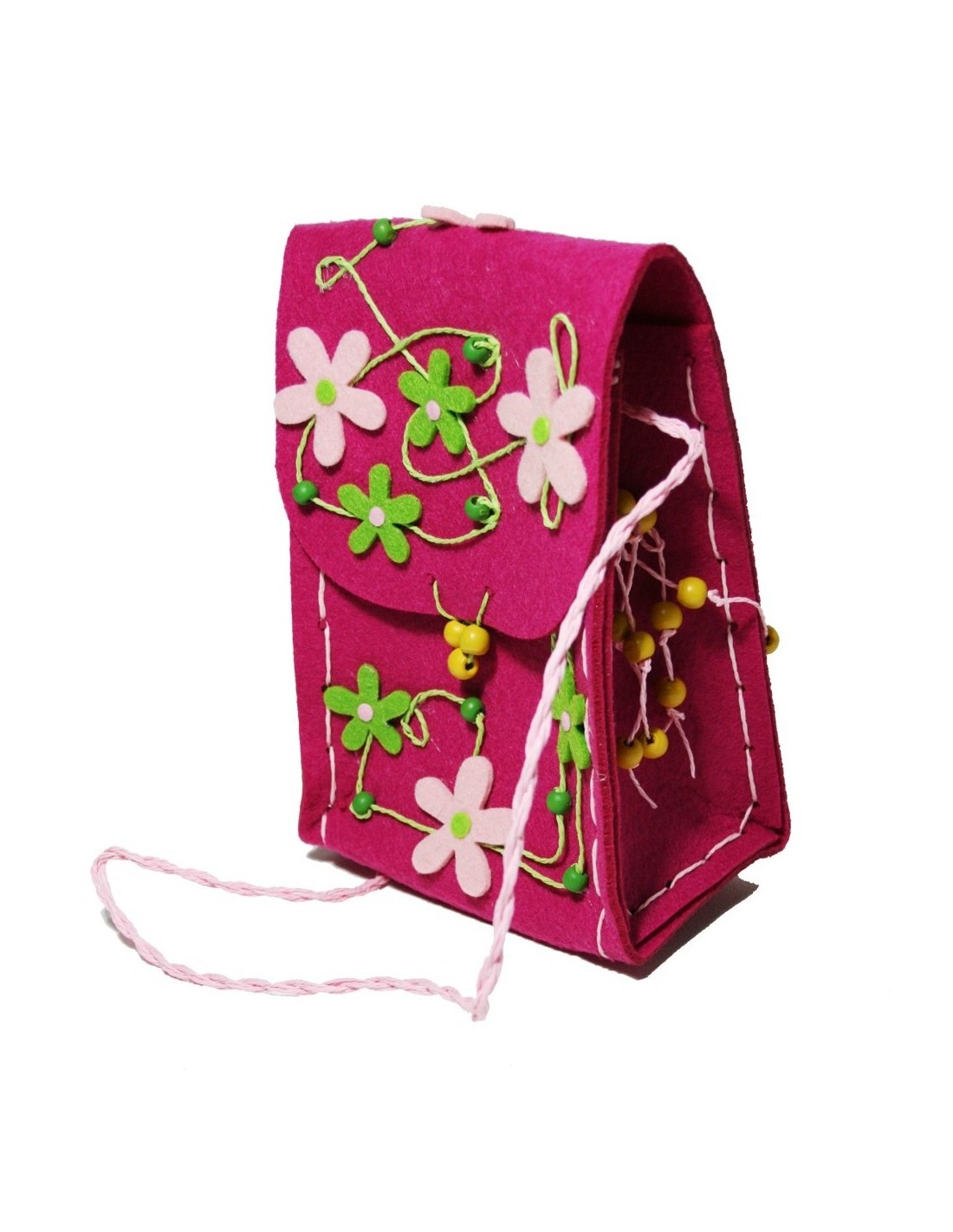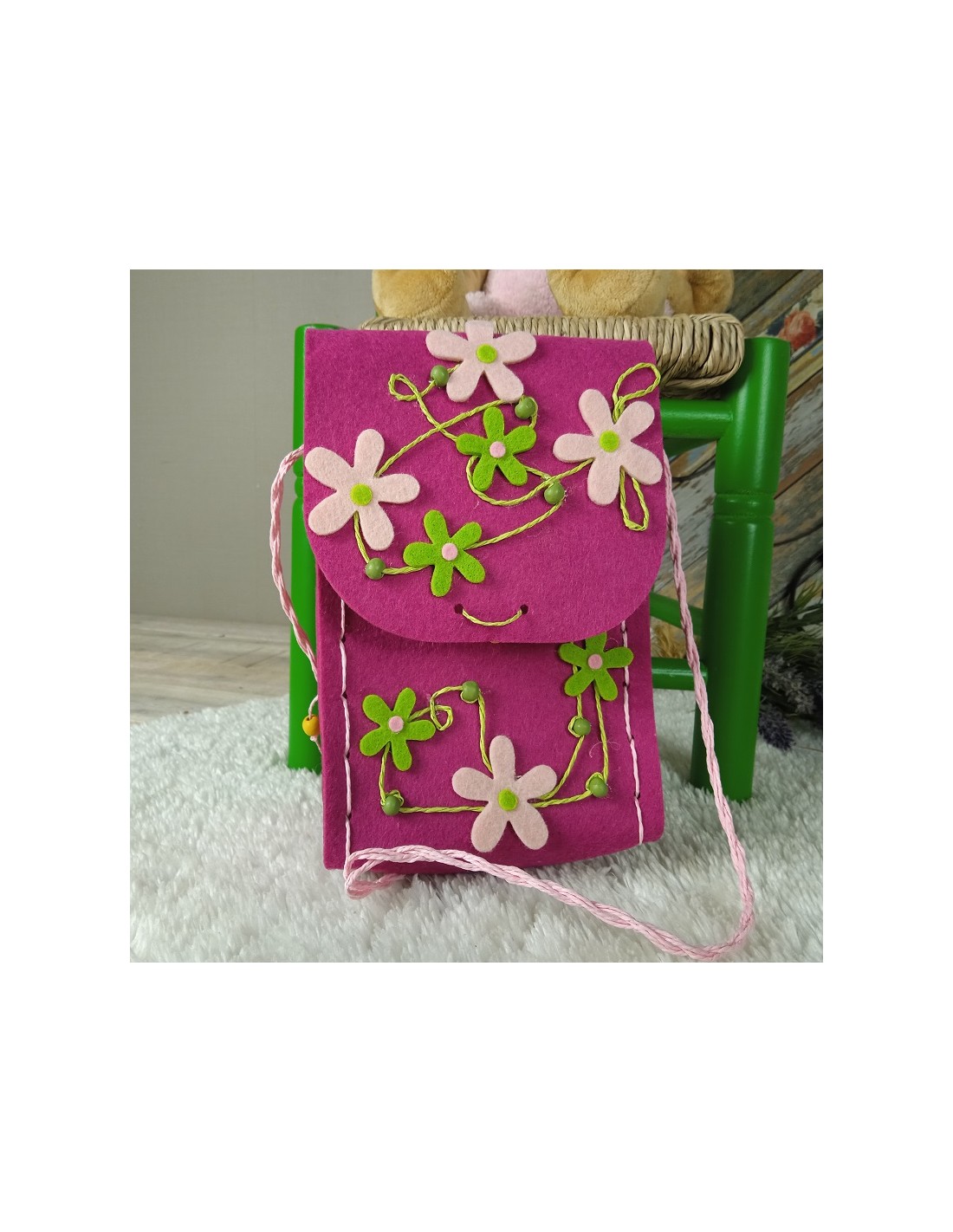 Sac à bandoulière en tissu feutré pour enfants orné d'un accessoire de mode à fleurs roses. Dimensions : 9x26x15 cm.