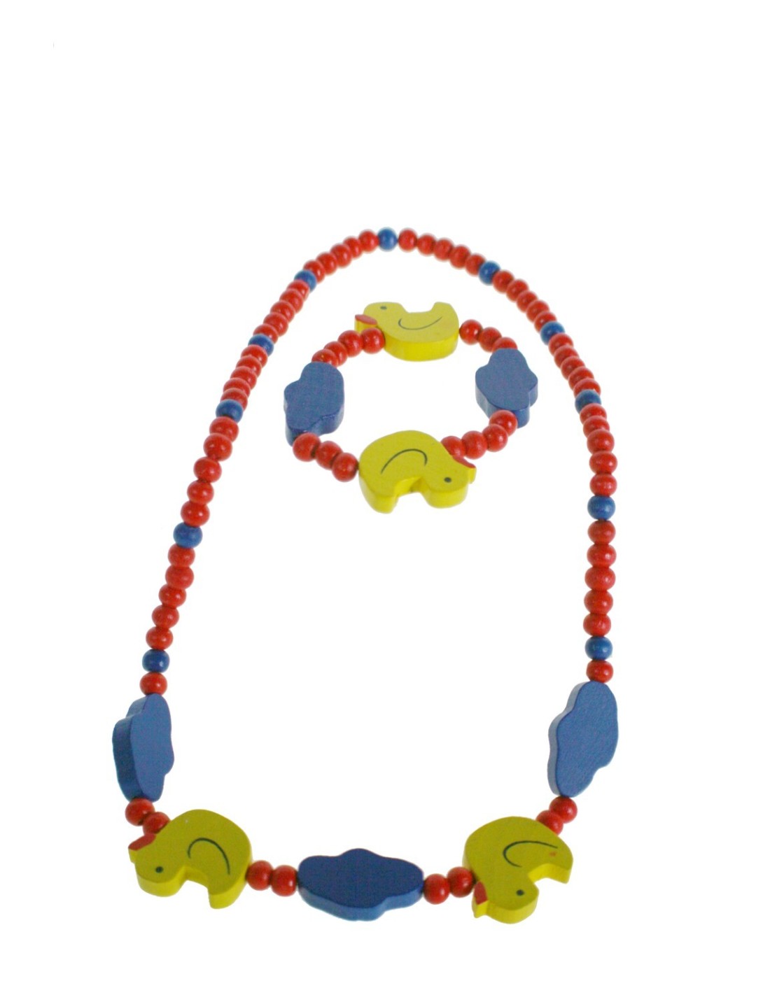 Pour les plus petites princesses de la maison. Un joli collier assorti au bracelet, tout en bois rouge avec un petit détail de canard. Avec caoutchouc élastique.Mesures: Sautoir 23 cm. Bracelet Ø5 cm.