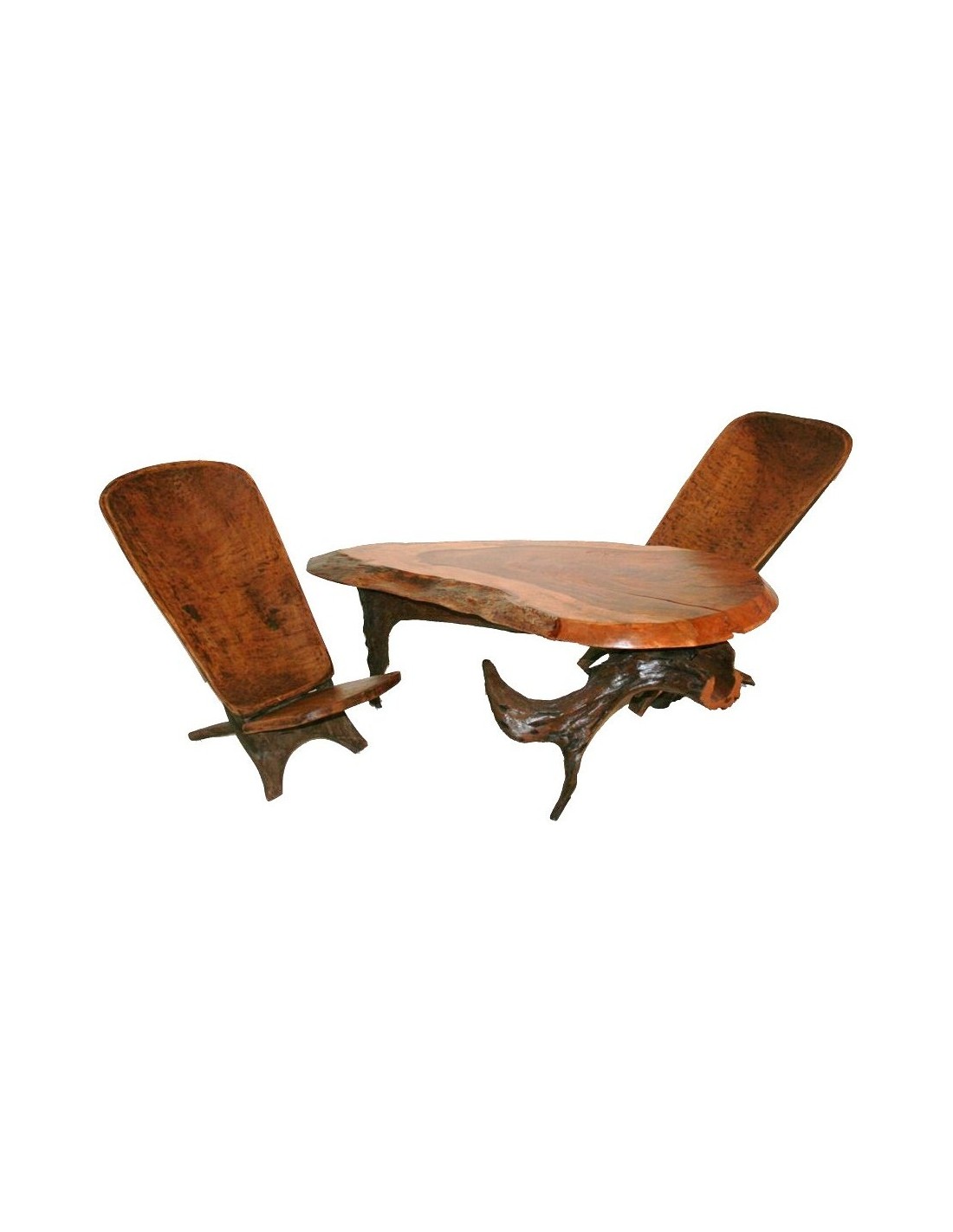 Ensemble table et deux chaises, fabriqué artisanalement en Côte de Marfil. , en bois d'iroko. Les chaises, sculptées d'une seule pièce et amovibles, présentent des gravures uniques d'une grande valeur culturelle.