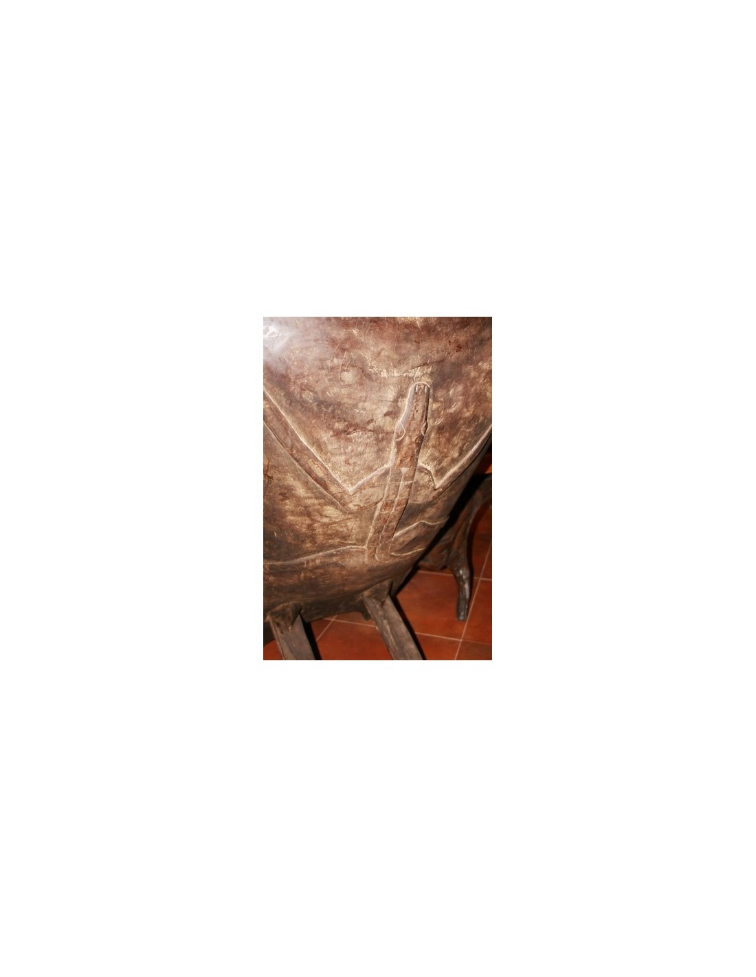 Chaque chaise présente des gravures uniques reflétant la tradition et l'esthétique africaines, faisant de cet ensemble une véritable pièce décorative chargée d'histoire.