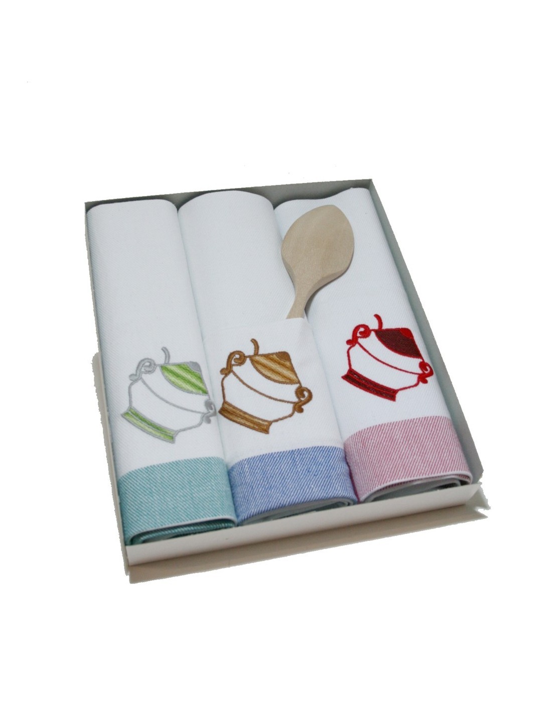 Ensemble de trois grands torchons blancs avec un motif de théière brodé et un ustensile de cuisine cuillère en bois. Torchon de cuisine idéal pour presque toutes les tâches de nettoyage de cuisine, de séchage, de polissage de vos verres, assiettes et ustensiles. Parfait pour un usage quotidien.