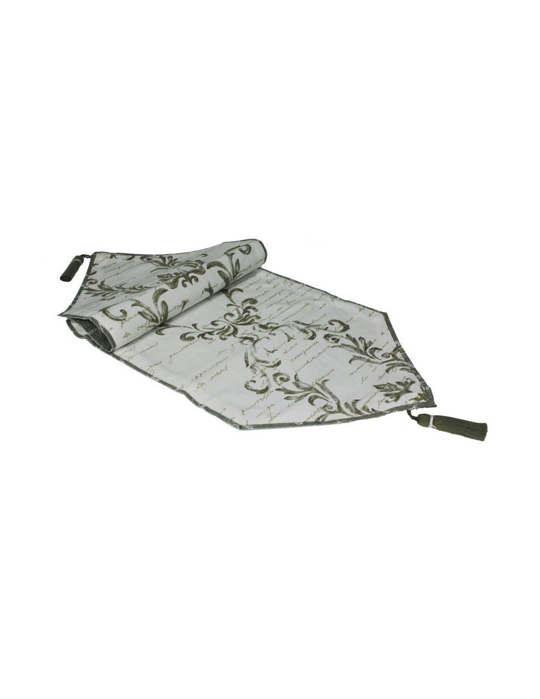 Chemin de table réversible à motifs décoratifs gris. Dimensions: 33x125 cm.