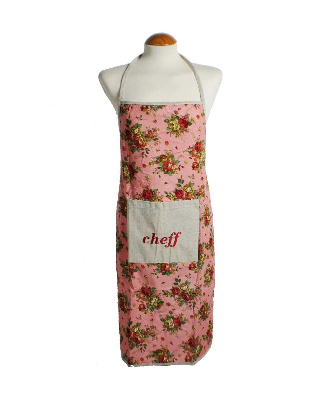 Tablier ajustable élégant comme une robe de style classique avec poche centrale rose avec fleurs et anagramme cheff brodée.