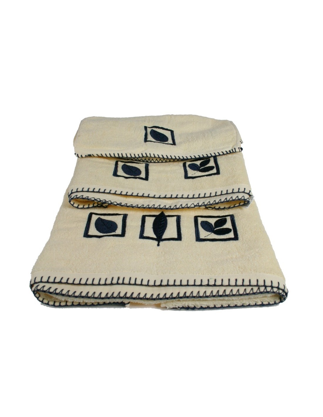 Ensemble de serviettes de bain écru à décor de broderies bleues et coutures de bord, pour une ambiance de style vintage, il décorera la pièce des toilettes de votre intérieur et mettra une touche de couleur dans votre quotidien. Un cadeau très original et unique.
