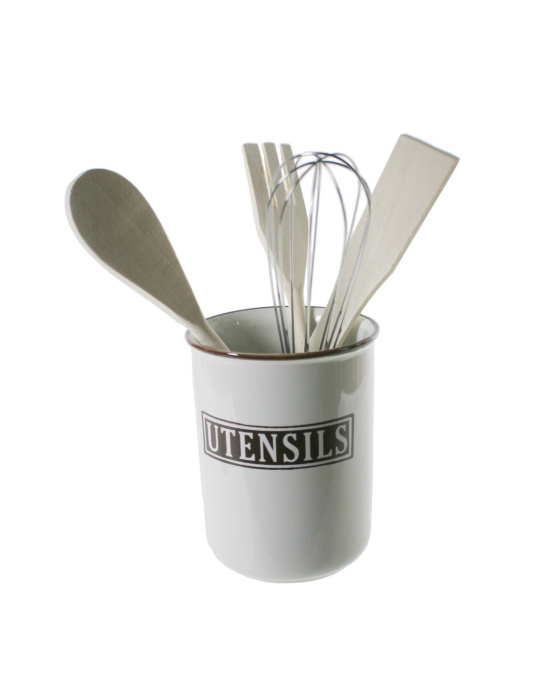 Ensemble d'ustensiles de cuisine avec pot en céramique. Ce pot en céramique de style vintage ira parfaitement dans votre cuisine.
