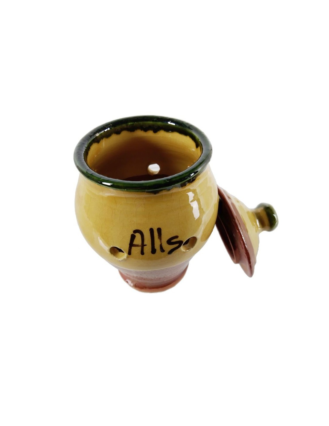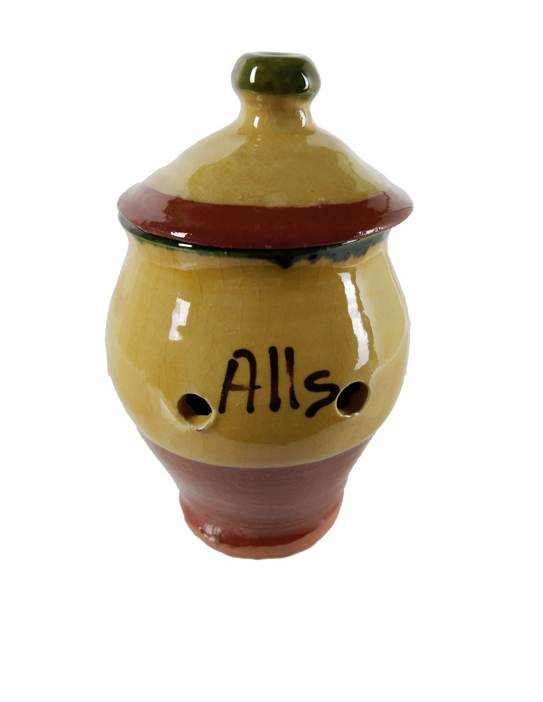 Pot en céramique très approprié pour conserver l'ail et d'autres épices, avec un couvercle. A avoir toujours sous la main, ce pot d'ail est pratique, décoratif et fonctionnel pour votre cuisine ou garde-manger, il contient des trous d'aération pour garder l'ail en bon état.
