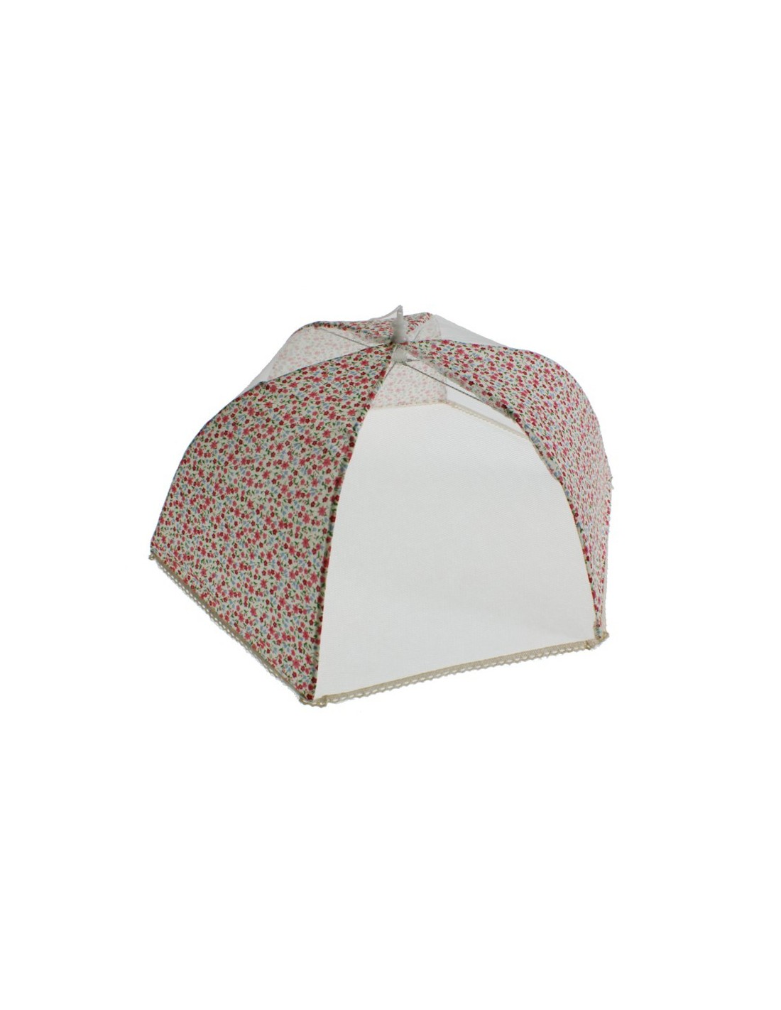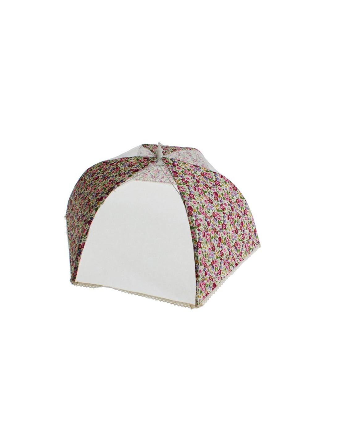 Protecteur pour couvrir les aliments sous la forme d'un parapluie pliant avec maille transparente et tissu fleuri, très décoratif pour la table de jardin.