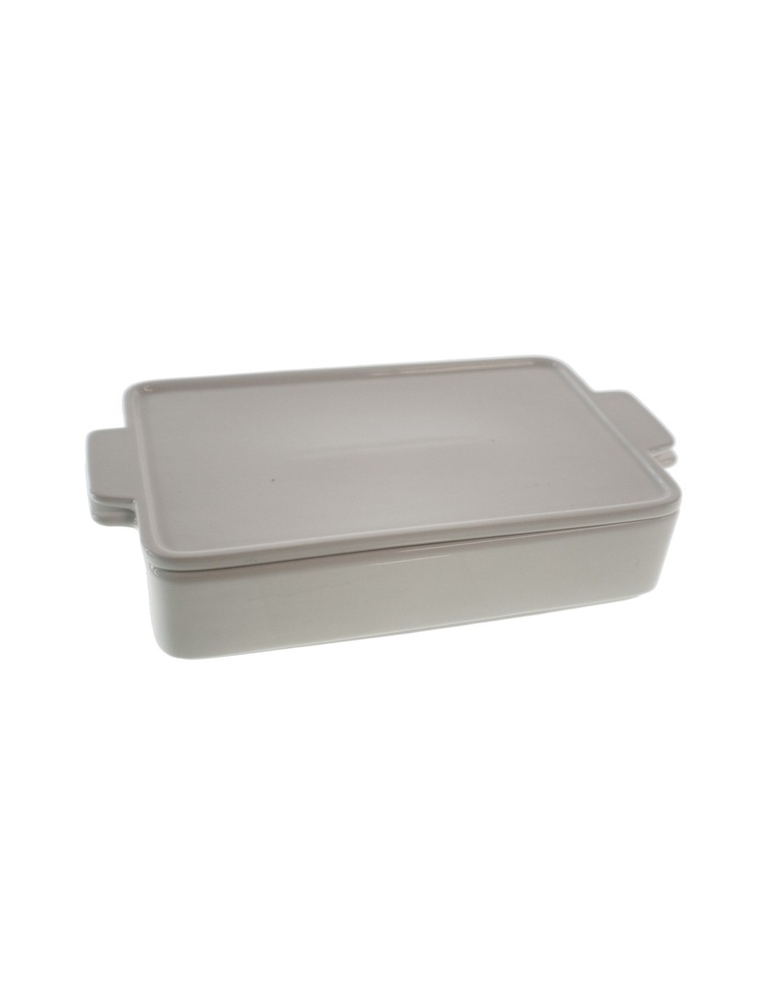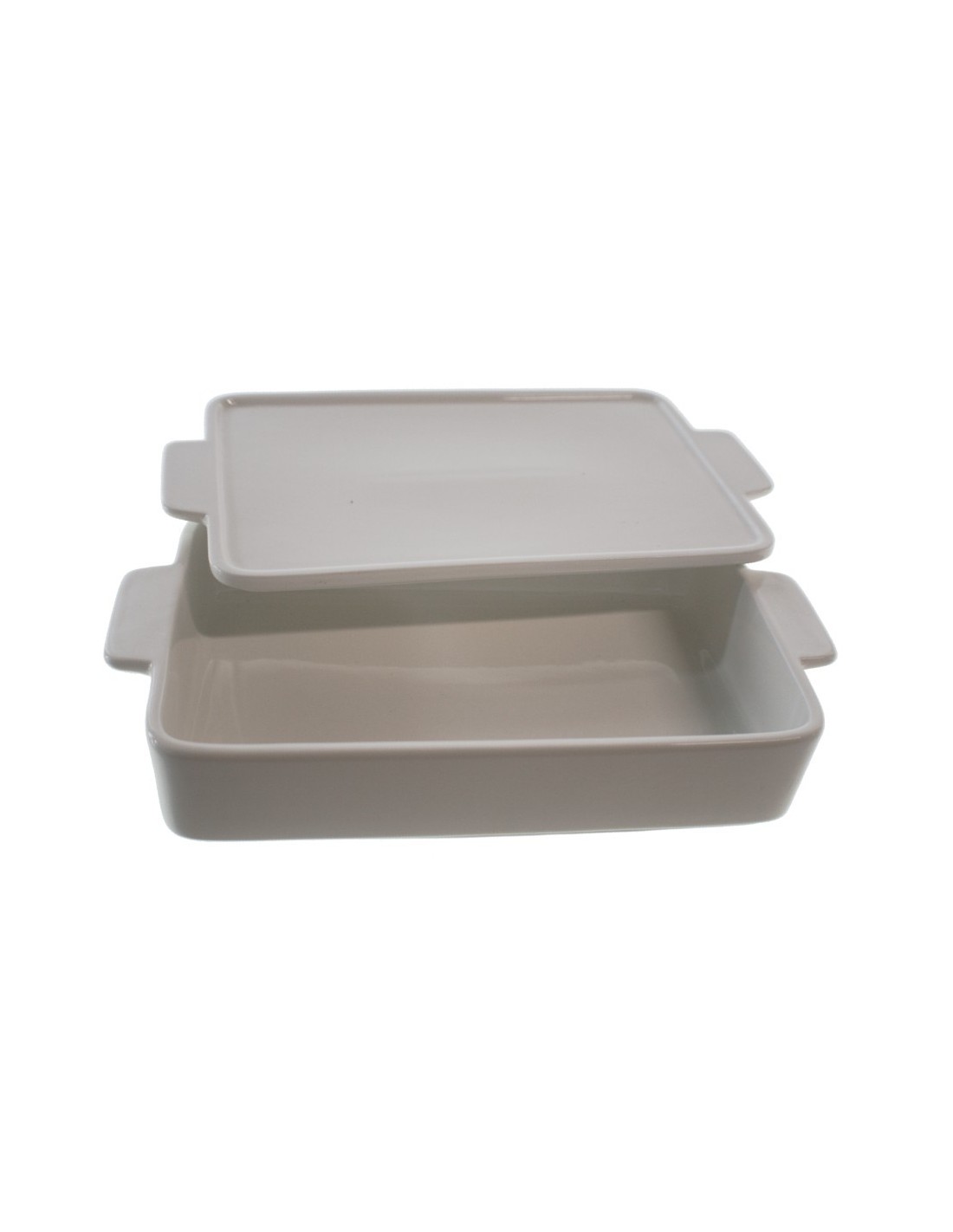Assiette rectangulaire empilable en céramique blanche avec couvercle. Indiqué pour la décoration de table et comme service individuel.