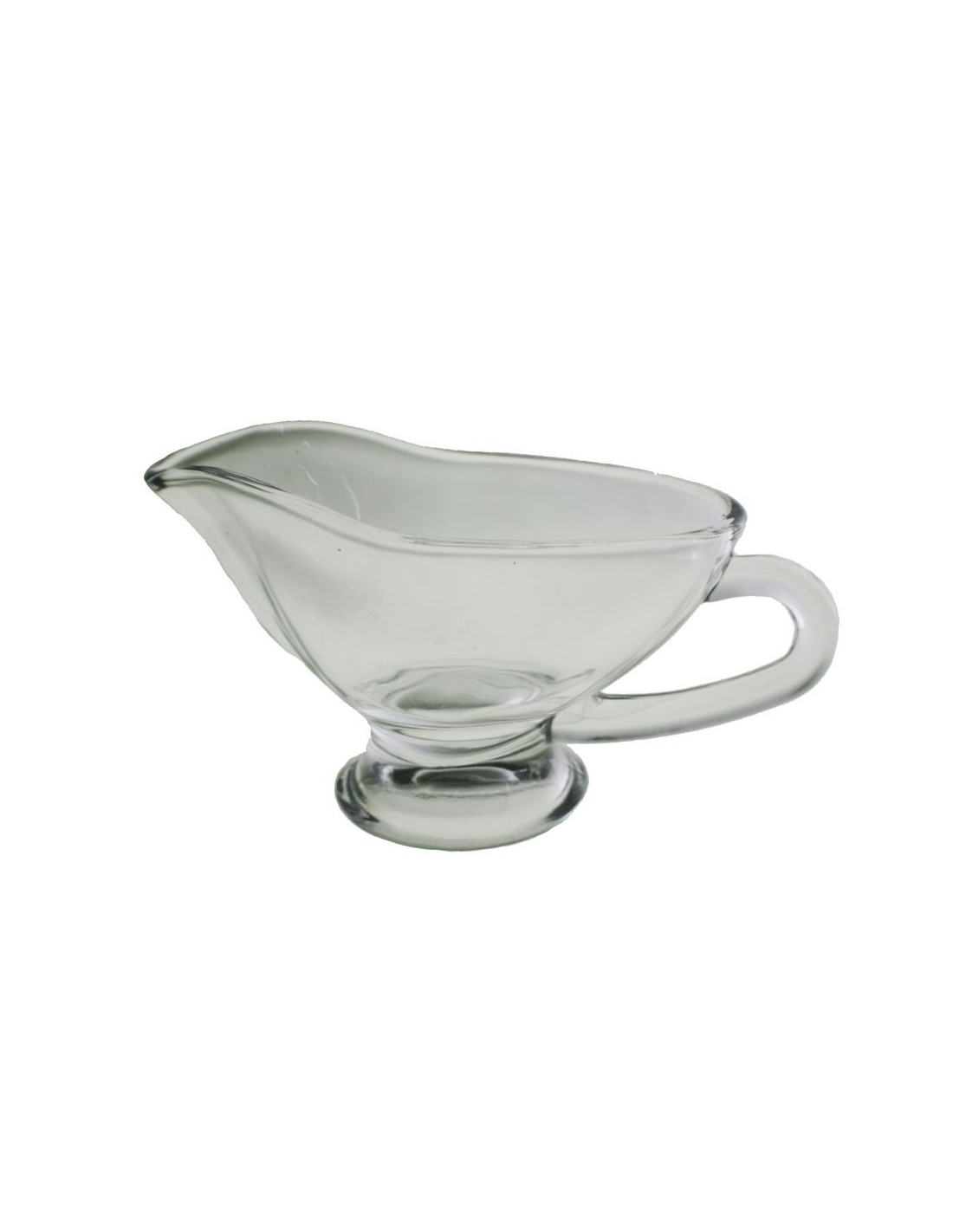 Saucière en verre avec anse pour pot à sauce pour servir les condiments ustensiles de cuisine. Dimensions : 16x9 cm.