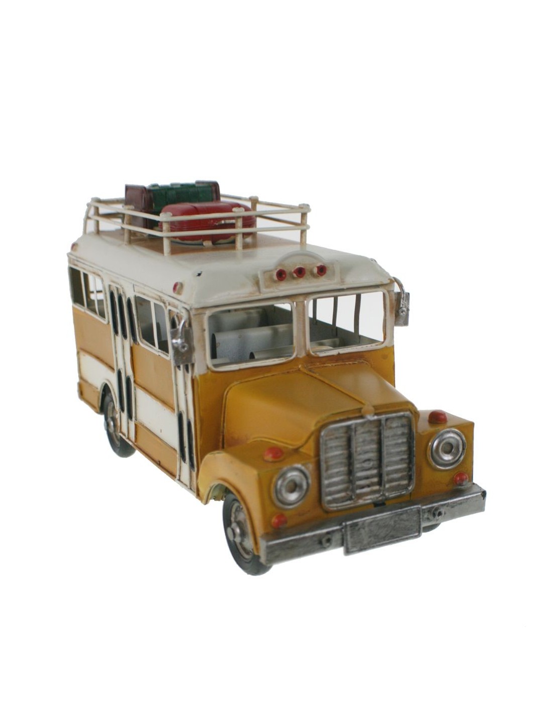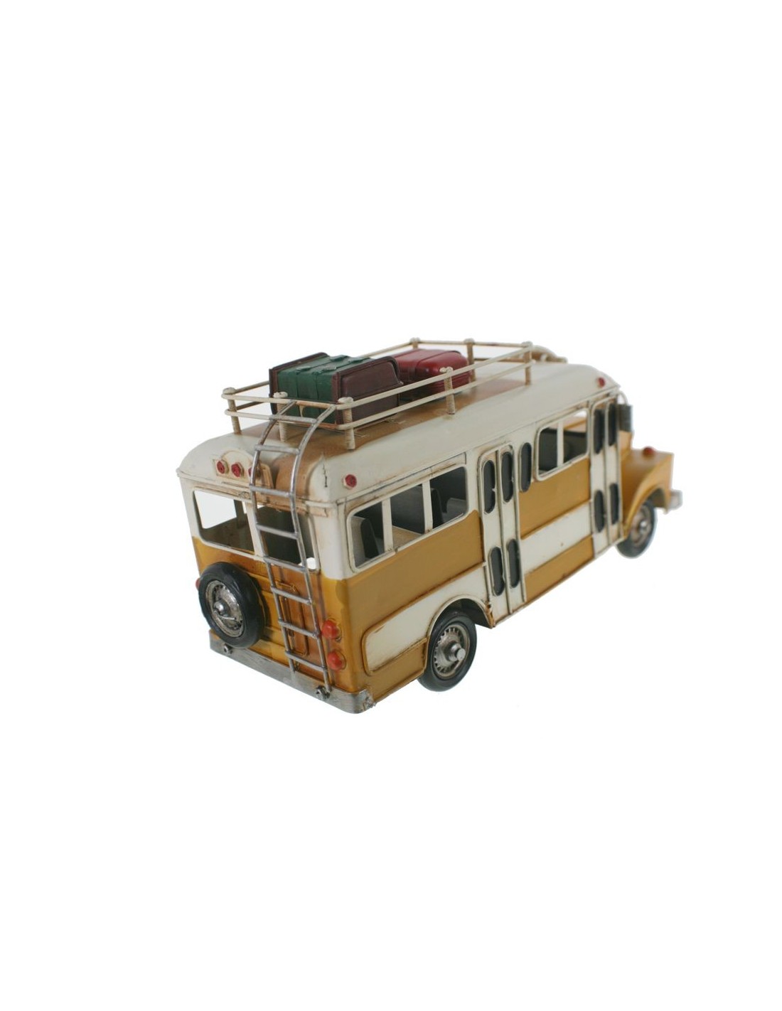 Réplique de style rétro bus en métal blanc et jaune pour les collectionneurs et la décoration.Dimensions:16x36x12cm.