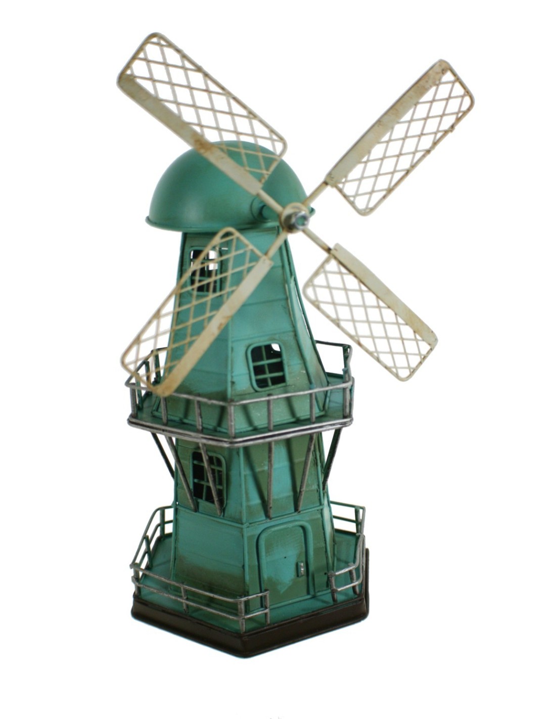 Réplique de moulin à vent en métal bleu, réplique de style rétro, idéale pour les collectionneurs. Dimensions : 30x18x14 cm.