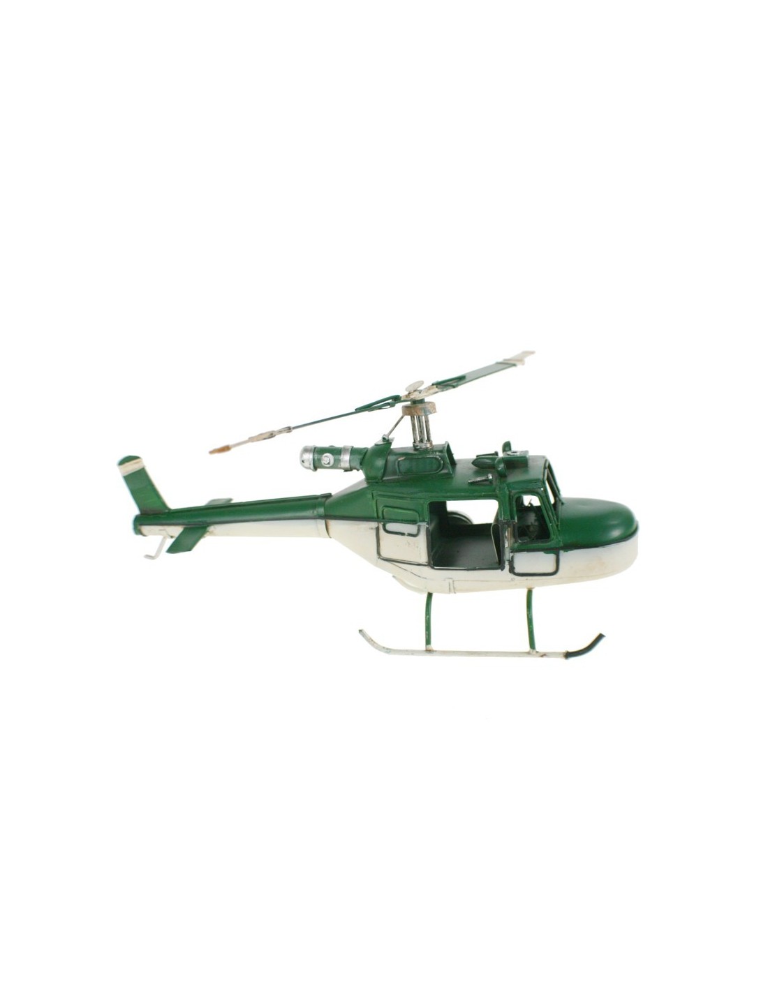 Hélicoptère en métal vert et blanc à deux pales pour la décoration, la maison et la collection. Dimensions : 18x32x11 cm.