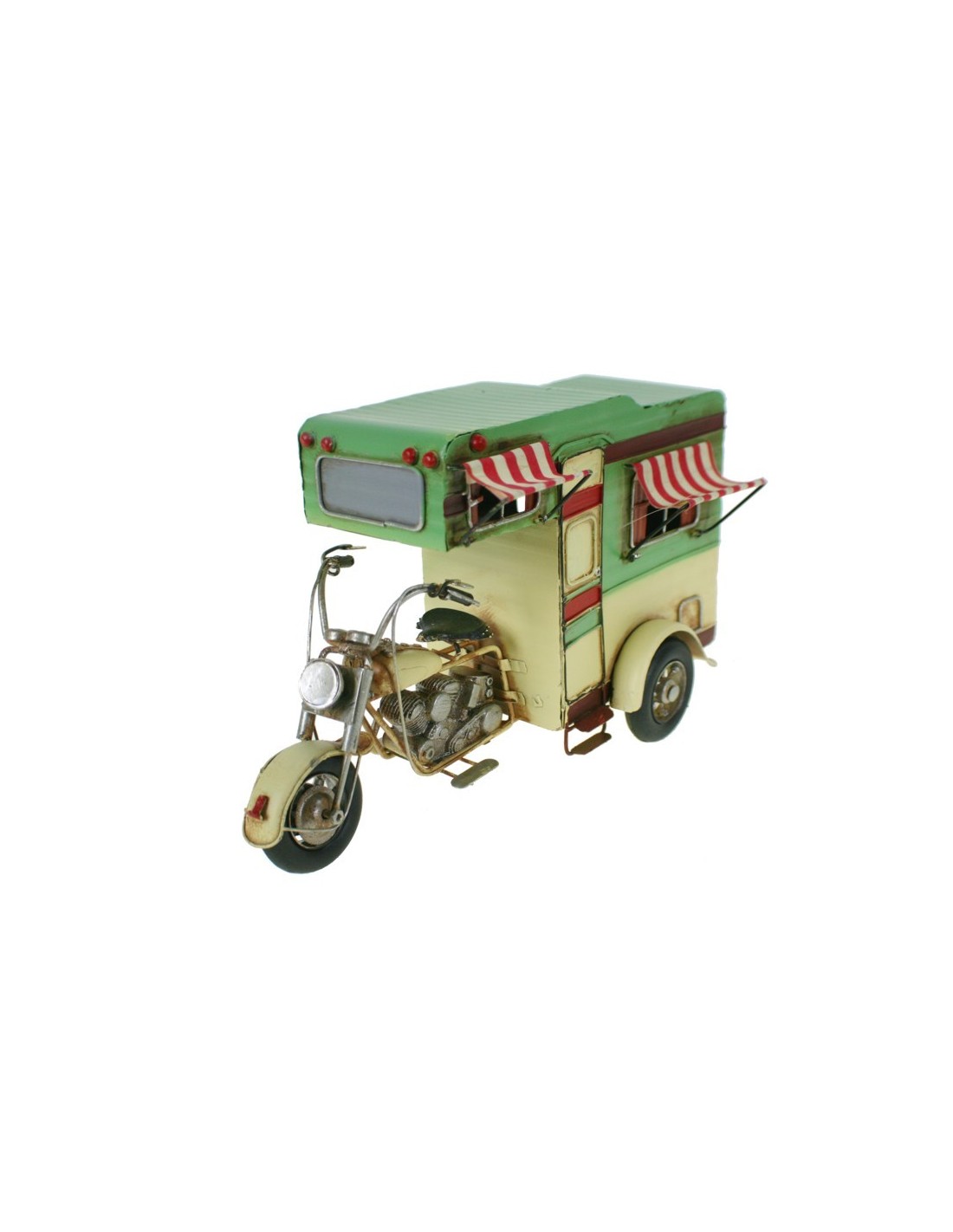 Moto de style vintage vert et écru avec collection de répliques de décoration de caravane. Dimensions : 17x25x12 cm.