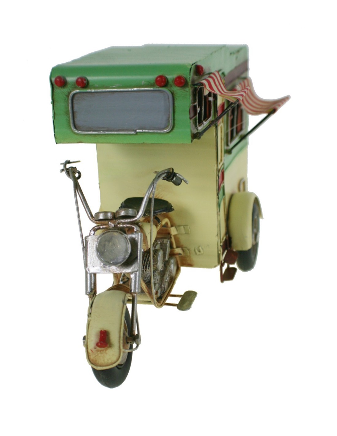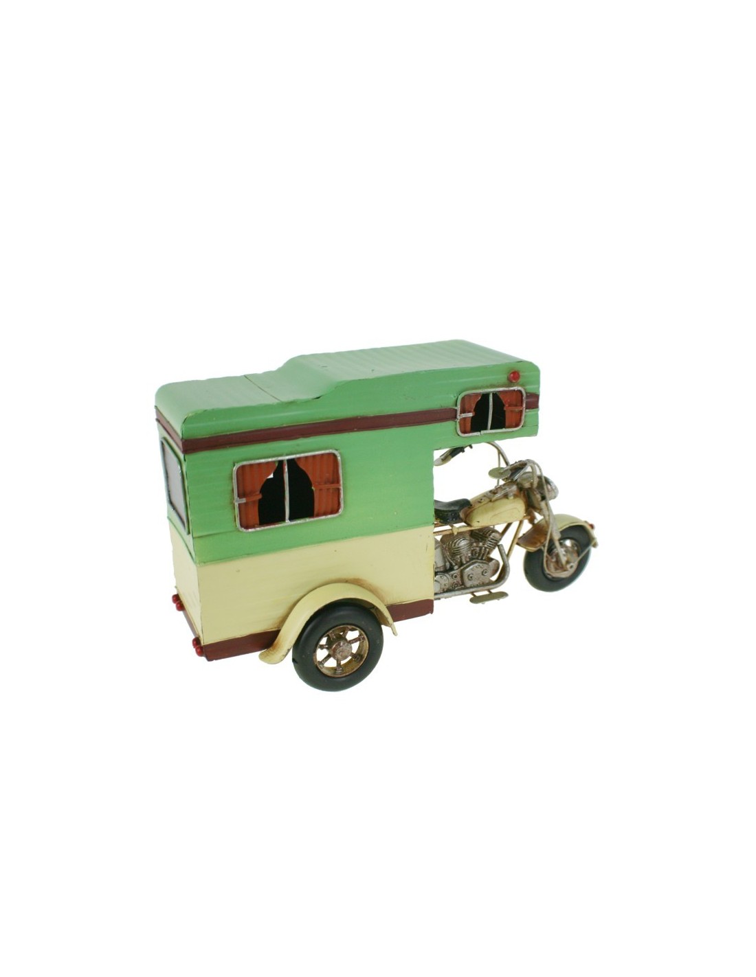 Réplique amusante de moto en métal avec caravane verte – Idéale pour les collectionneurs et la décoration.