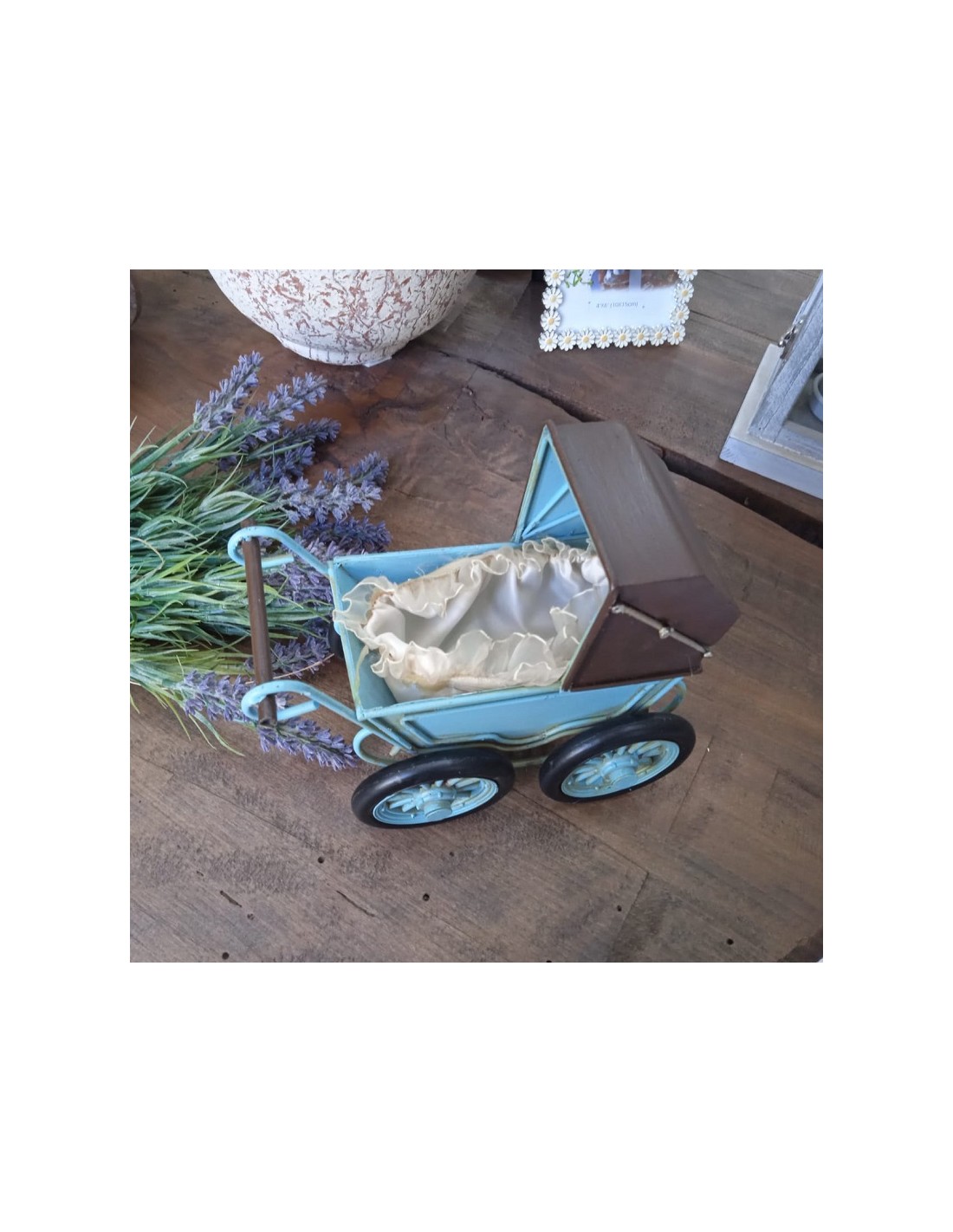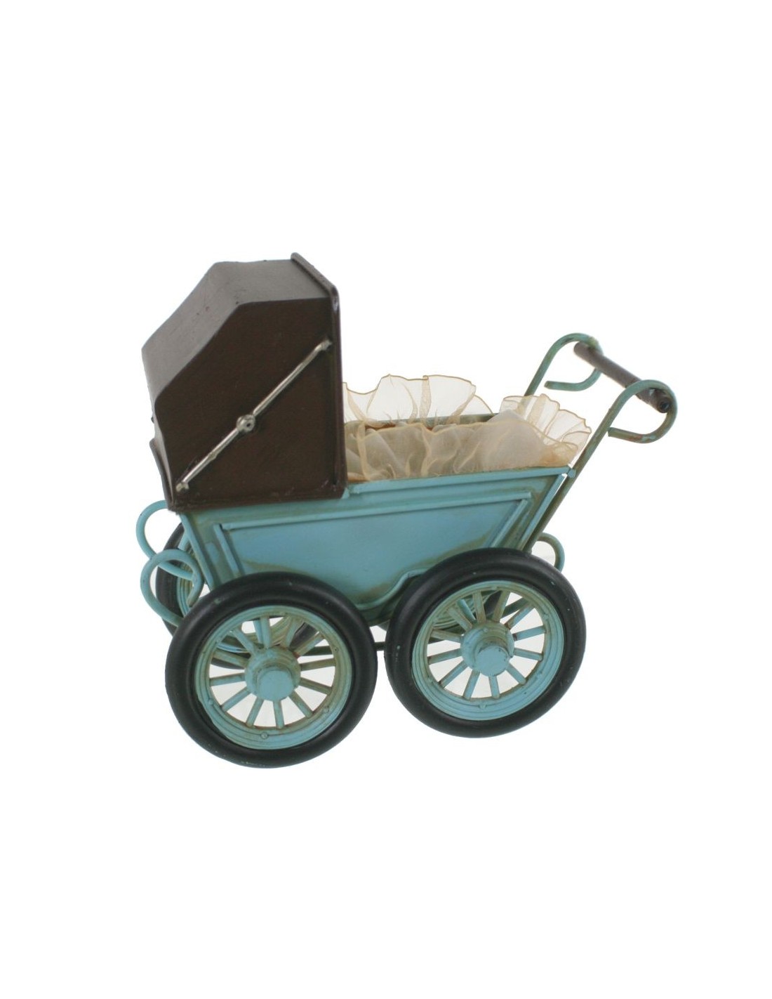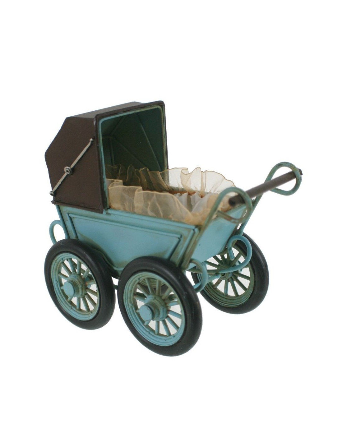 Figurine de poussette en métal bleu rétro avec détails en dentelle à l'intérieur. Idéal pour la décoration élégante et discrète de n'importe quelle pièce ou hall.