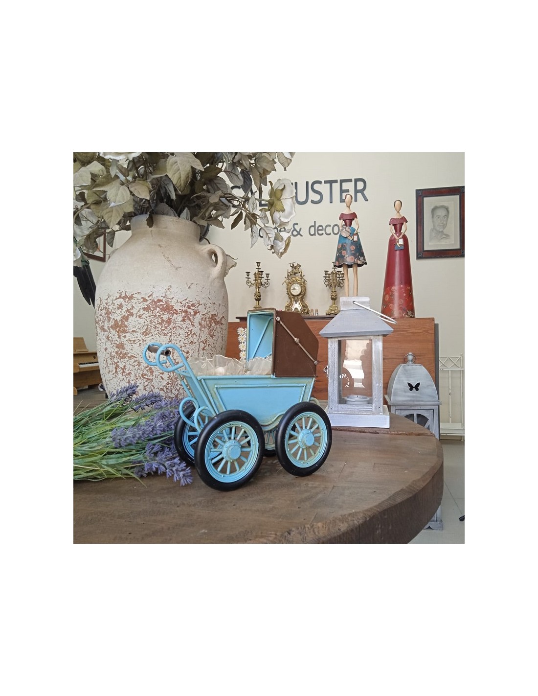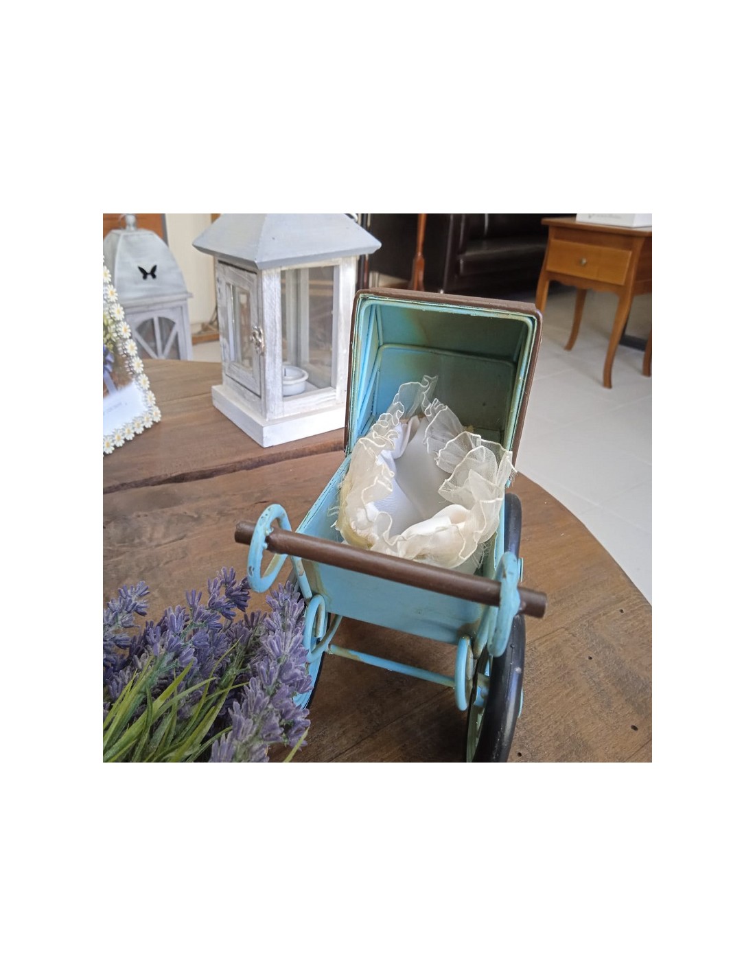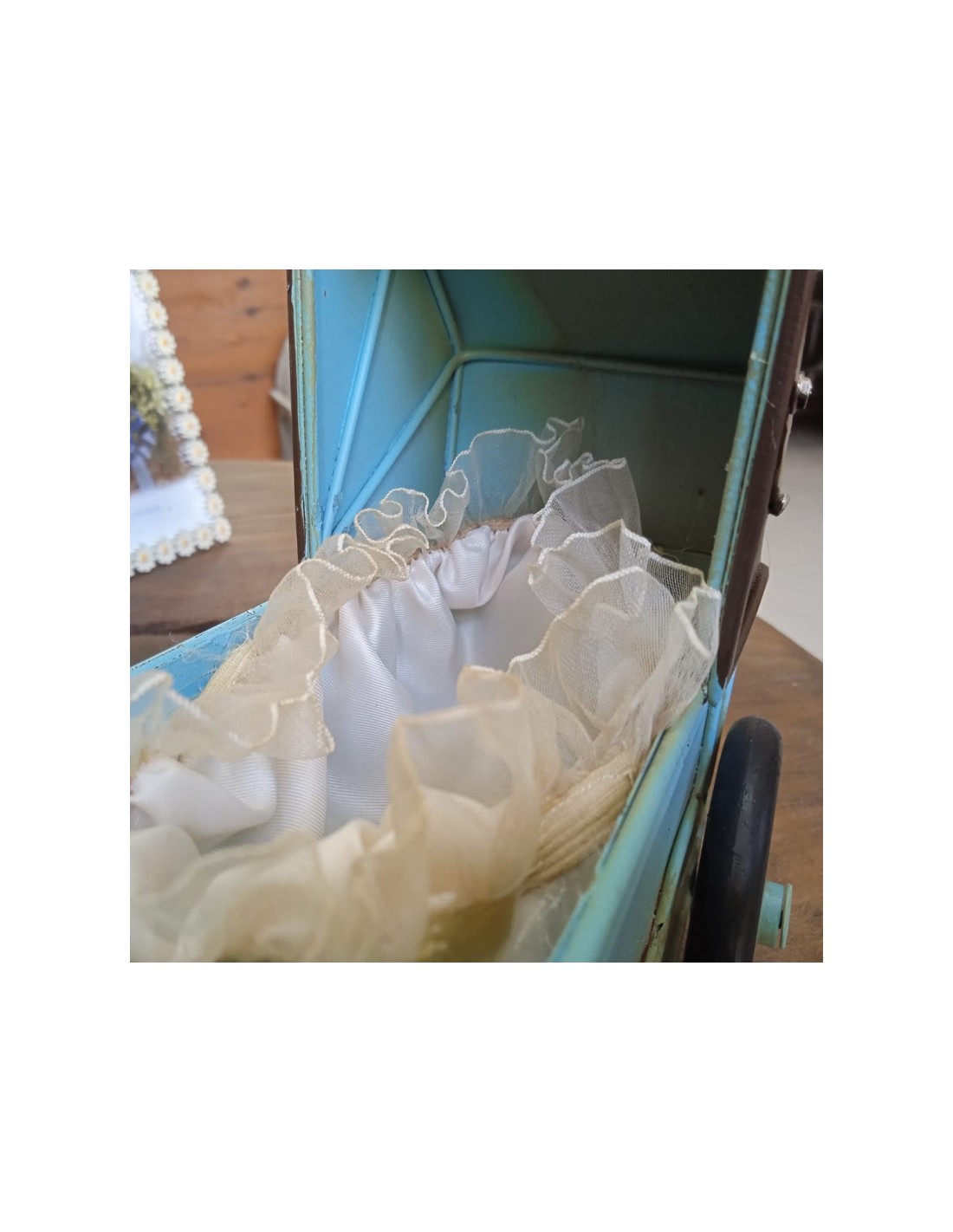 Figurine de poussette en métal bleu rétro avec détails en dentelle à l'intérieur. Idéal pour la décoration élégante et discrète de n'importe quelle pièce ou hall.