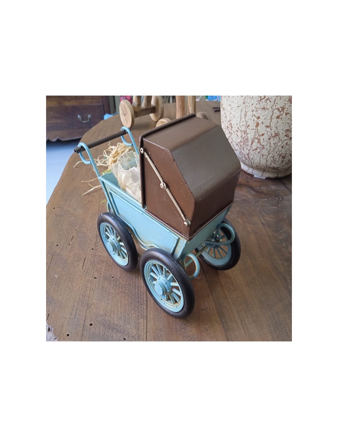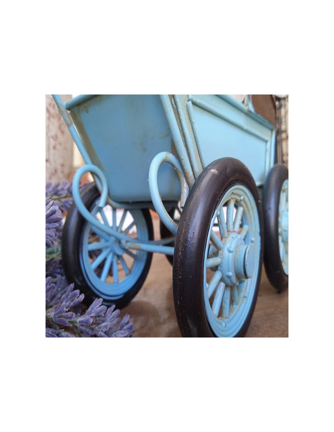 Réplique de poussette de bébé en métal bleu, décoration de style vintage, détail pour enfants. Dimensions : 18x20x11 cm.