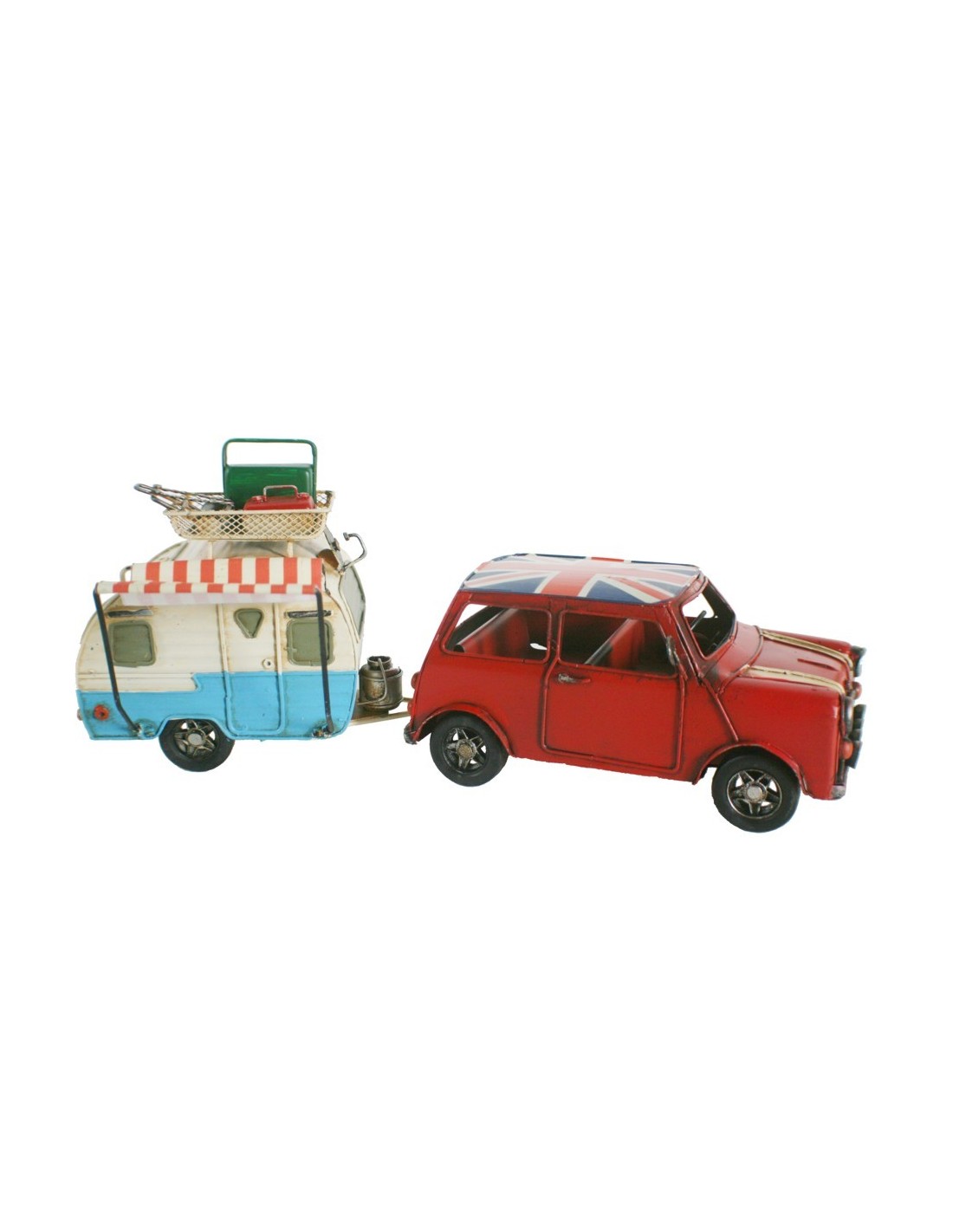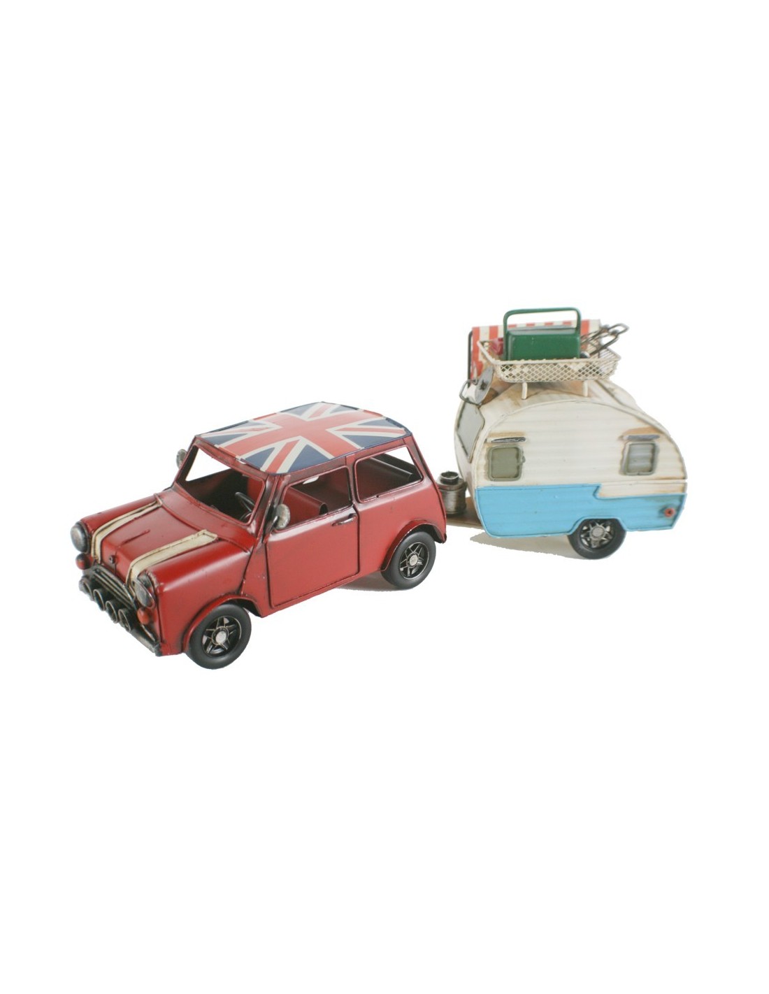 Réplique de style rétro d'une mini avec un drapeau anglais sur le capot et une caravane tractée. Un objet de collection qui évoque la nostalgie britannique, idéal pour les amateurs de classiques.