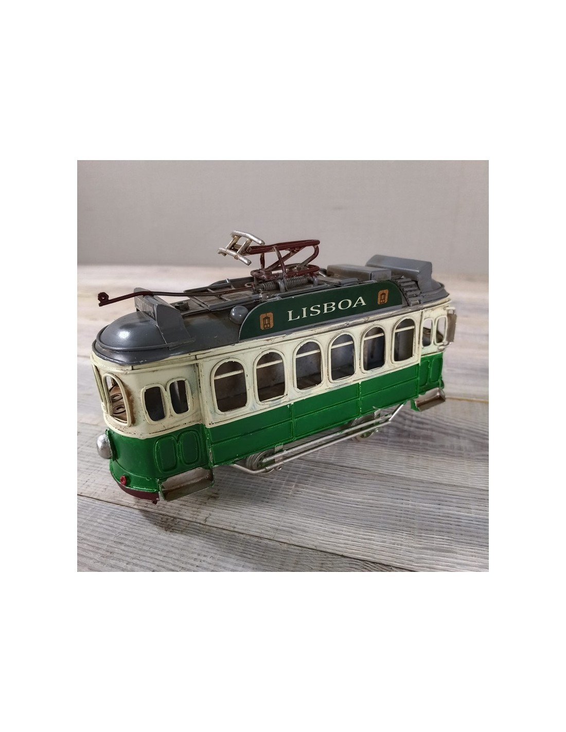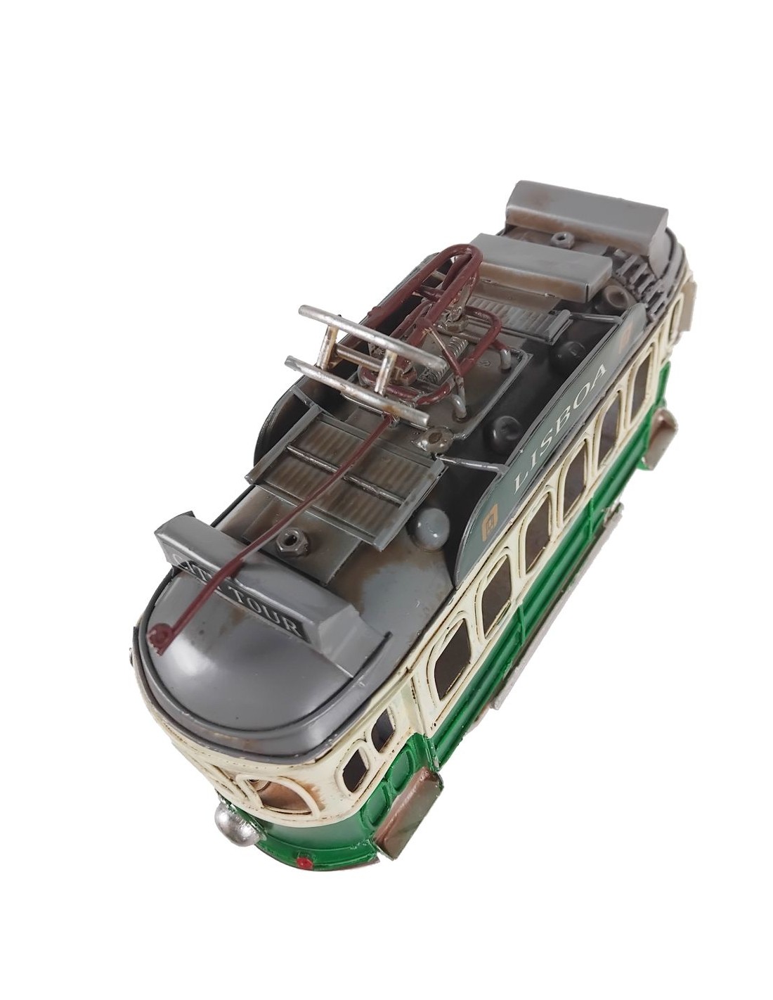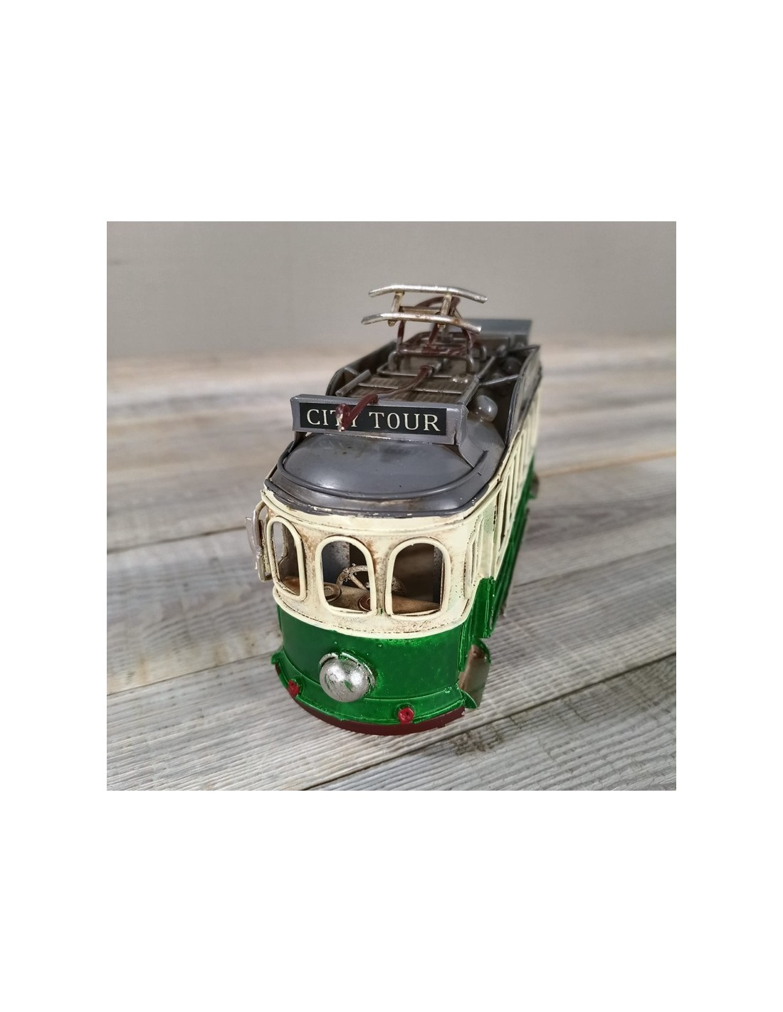 Tramway vert en métal de style rétro alliant objets de collection, décoration et une touche de nostalgie urbaine.