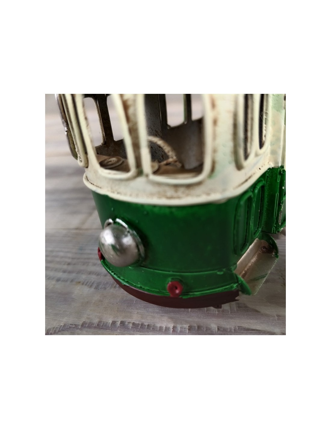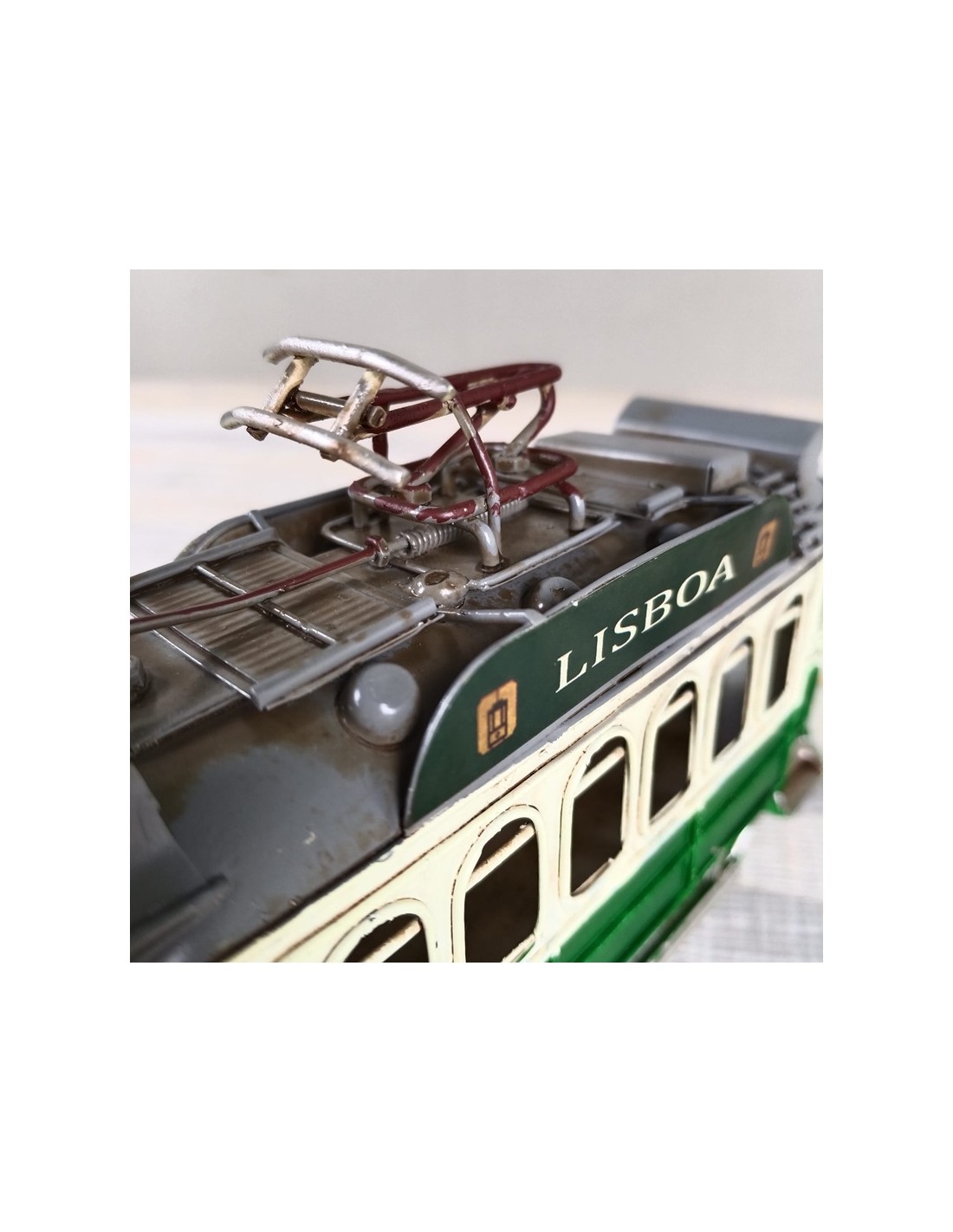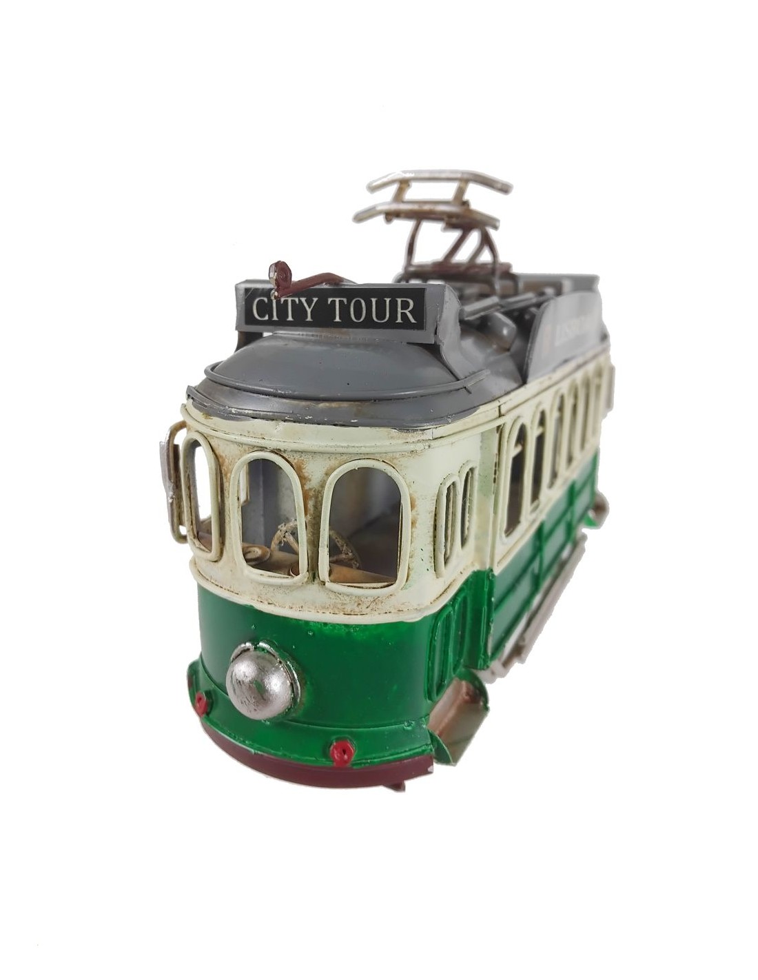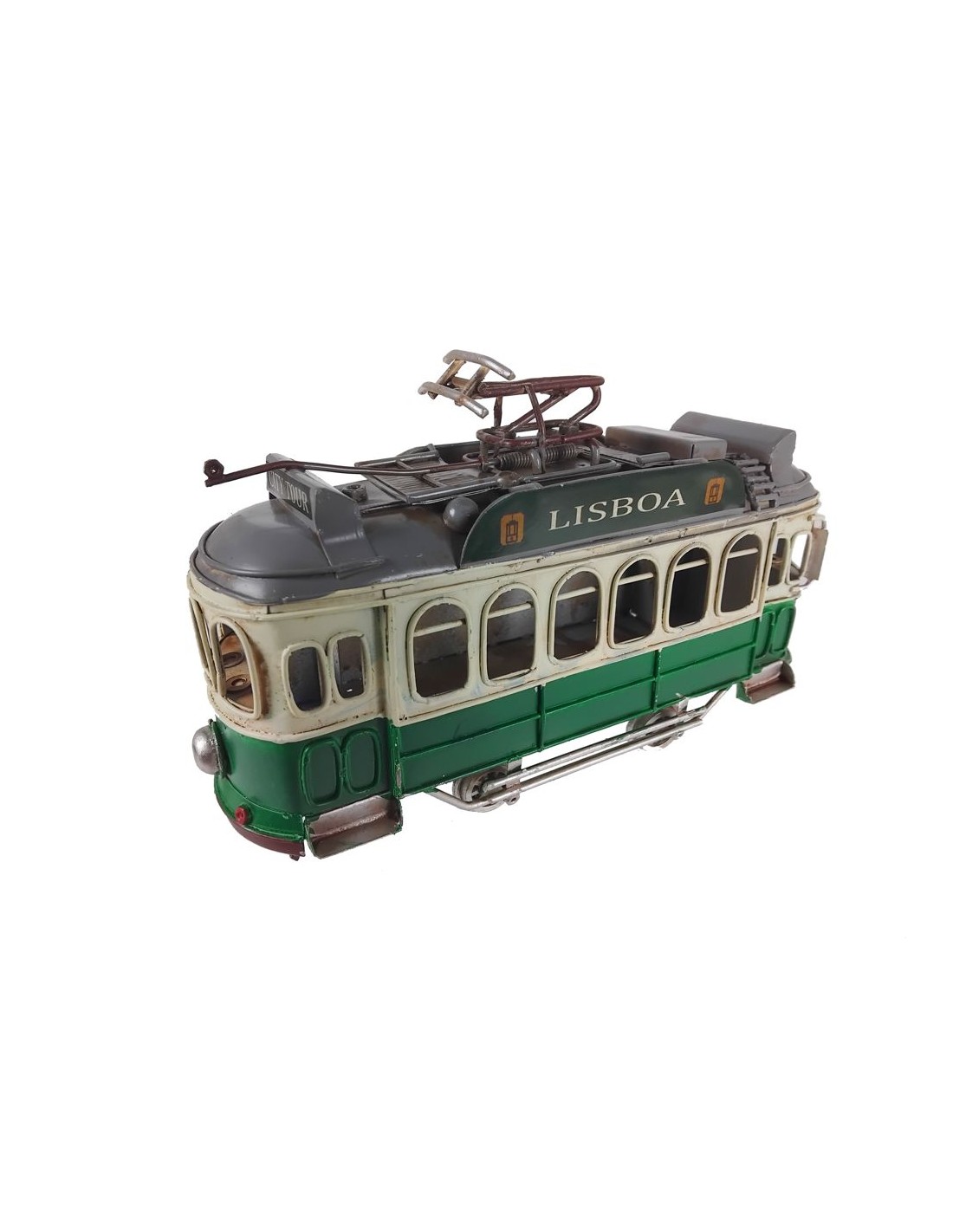 Tramway vert en métal de style rétro alliant objets de collection, décoration et une touche de nostalgie urbaine.
